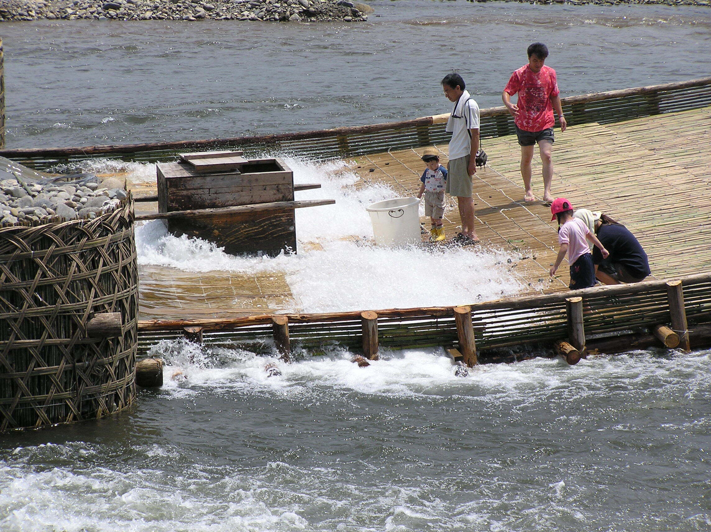 アユ放流体験の後は、塩原温泉を流れる箒川河畔の常設池でつかみどり。