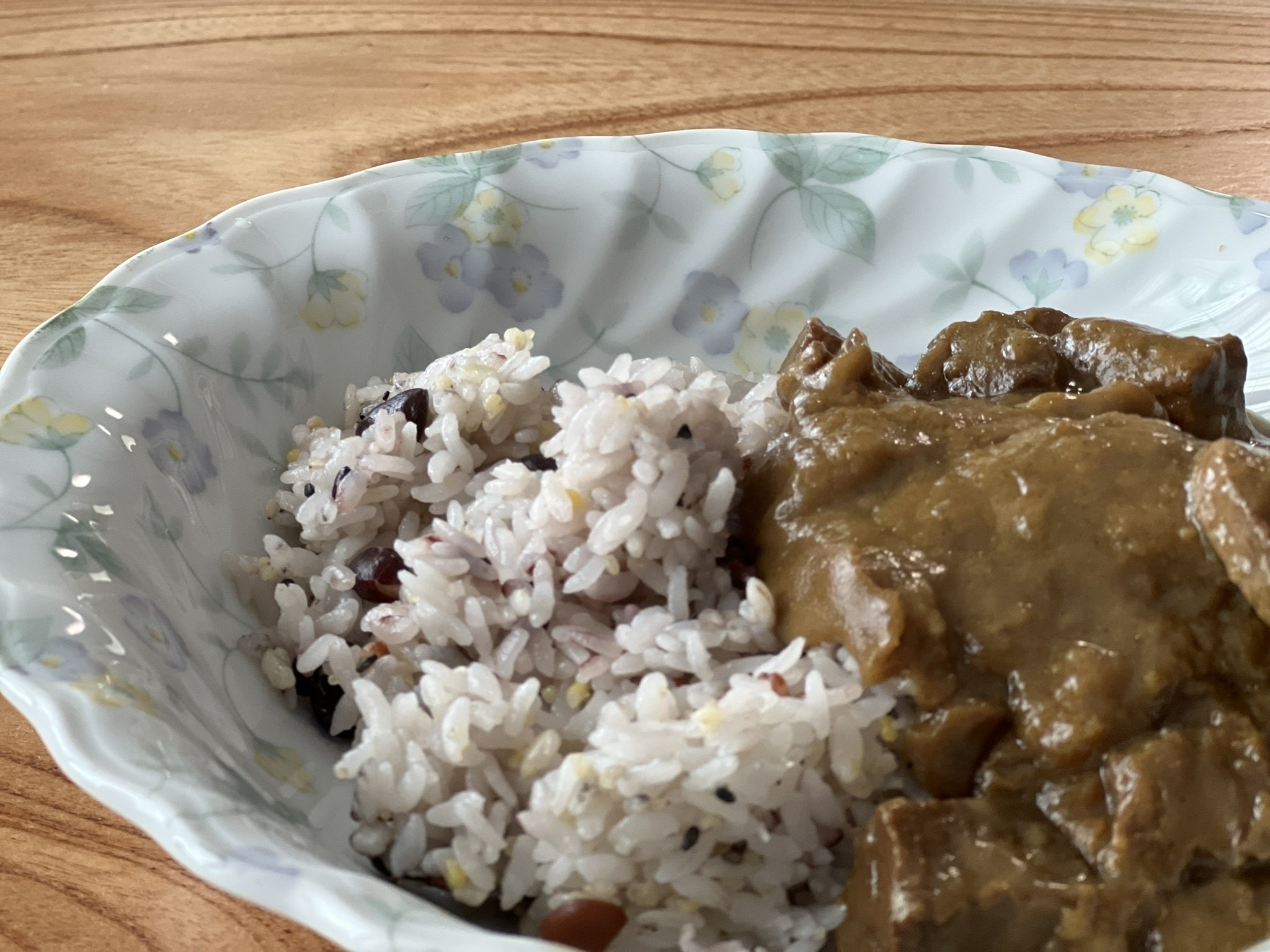 たくさんの方に支援していただいて気分がよかったので、お昼ご飯は大好物のカレーライスにしました。近所で買ってきた牛タンカレーに、お昼に炊いた五穀米で。