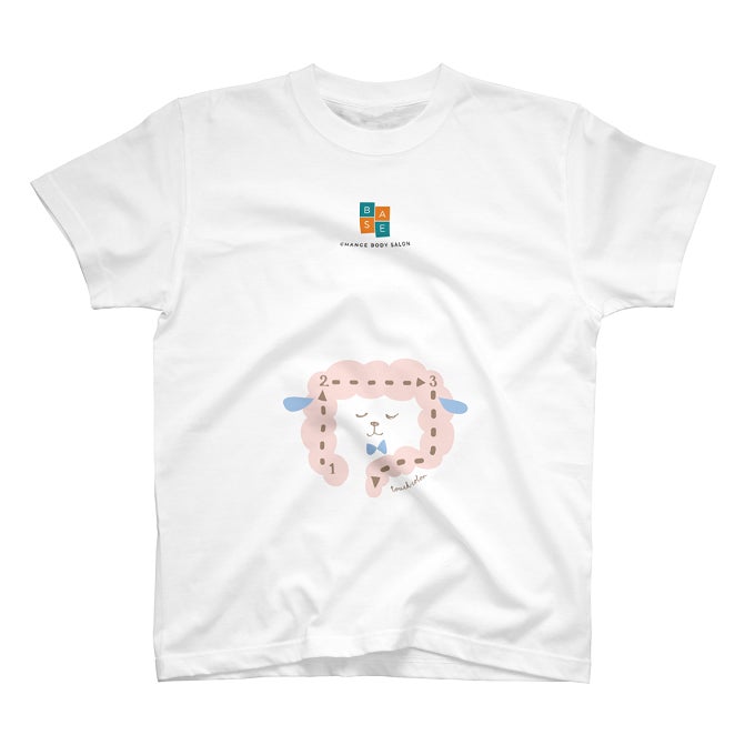 このティシャツを着て腸のセルフマッサージを紹介しています。