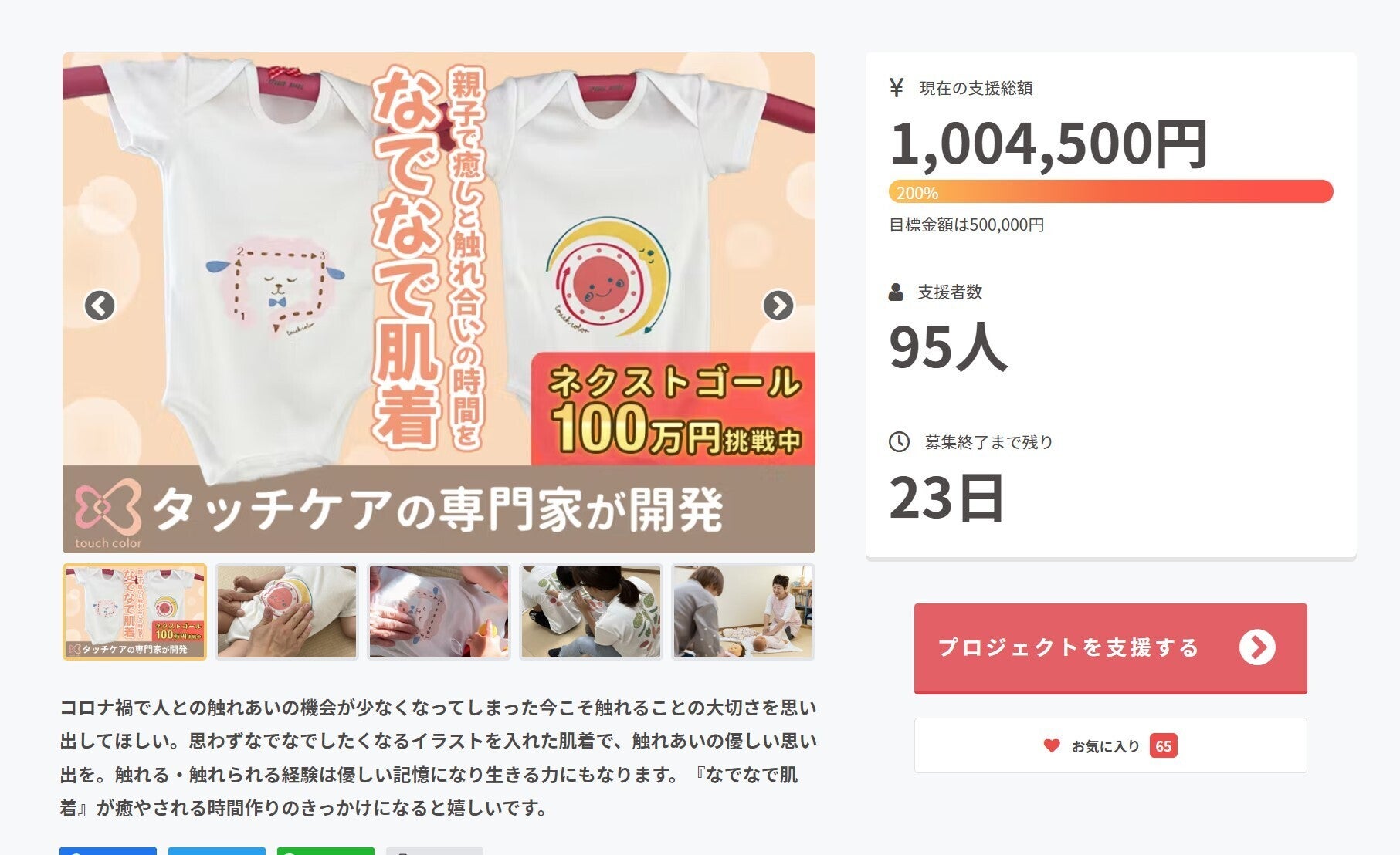 開始1週間でネクストゴールである100万円を達成しました。みなさま応援、ご支援を本当にありがとうございます。このプロジェクトが始まってから多くの方に声をかけていただきました。「応援してるよ」「毎日みてるよ」「知り合いにも伝えたよ」「お友達の出産のお祝いに選んだよ」「親子で着るのを楽しみにしています」「お人形に着せて、お教室でママや赤ちゃんに可愛がってもらいます」などなど。この肌着ができるまでにも、「面白い商品だと思うからぜひ実現させてね」「あきらめないで」「一つの方法が無理なら、次は他の方法を考えよう」「きっとできるから」と多くの方から、声をかけていただき、アイデアをたくさんいただきました。感謝してもしきれません。ありがとうございます。「ふみさんは、全速力で走ってるでしょ。たまには休んでね。お茶でも飲んでホッとしてね。」という言葉もかけてもらいました。ありがたいです。しかししかし、走り出したものは、なかなか休めない(笑)全速力のスピードはさらに加速しています(笑)止まれないのが、私の性分で・・・あと3週間頑張っていきたいと思います。次は開発費・制作費の100%となる150万円に向けてサードゴールを設定したいと思います。みなさま見守っていてください。この度は本当にありがとうございました。