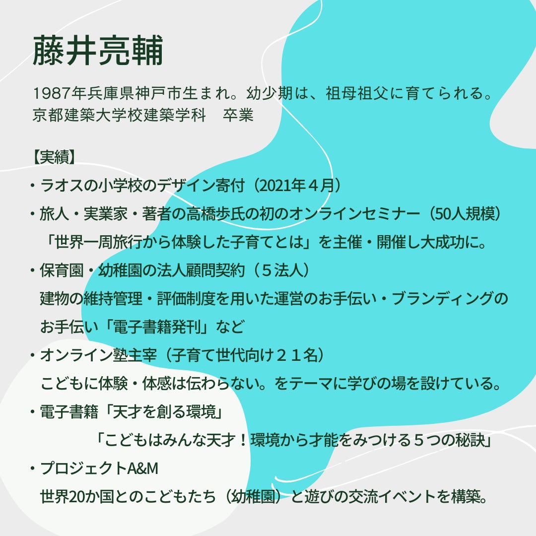 2016年に「藤井亮輔建築設計事務所」を開業しました。神戸市在住の34歳で、これまでに保育園、幼稚園の設計デザインや管理業務などを中心に、103園・延べ5000人以上の子どもの施設に関わってきました。(建築のテーマは「FEEL」大きなおもちゃとしてこどもの感受性を育てるデザインを提唱 /神戸・西宮・姫路・尼崎・大阪・東京・京都・熊本 )