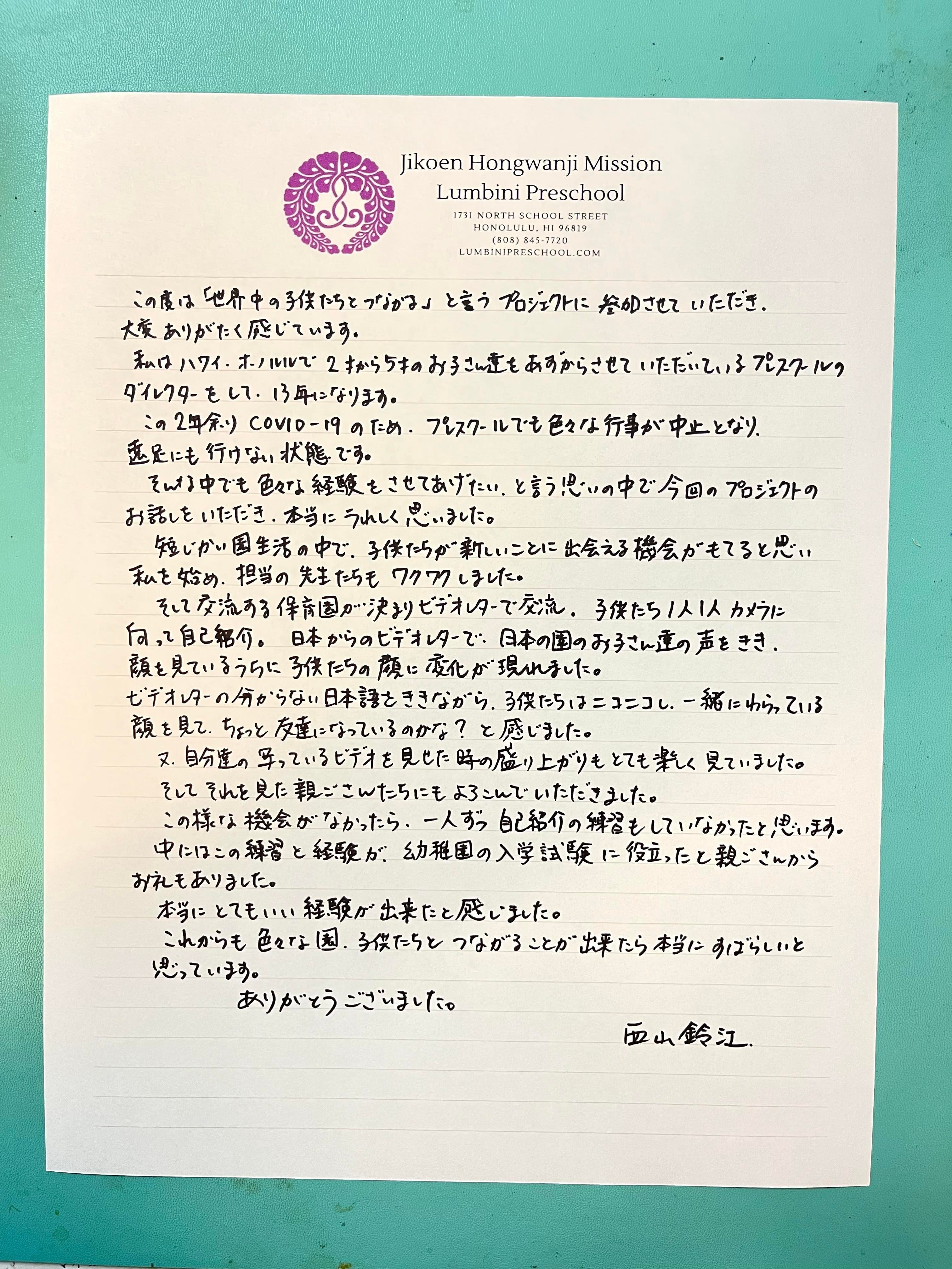 A&Mプロジェクトを実施したハワイの幼稚園の園長先生からいただいたお手紙です