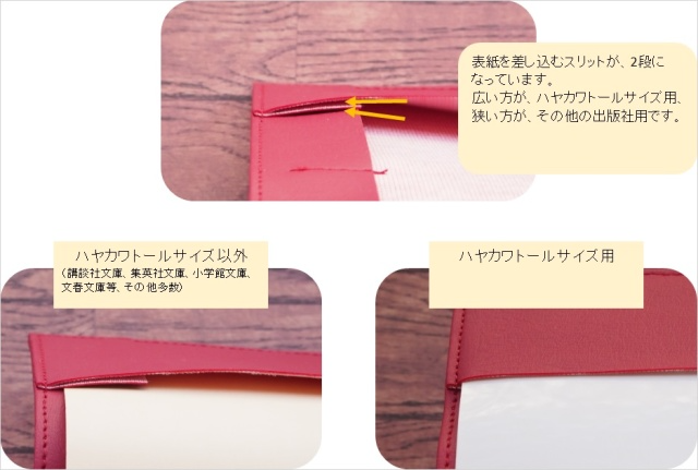 そのため、本商品では148mm~152mmの各出版社の文庫本を入れるスリットと、ハヤカワ文庫トールサイズを入れるスリットを分けて差し込むことができるようにしました。