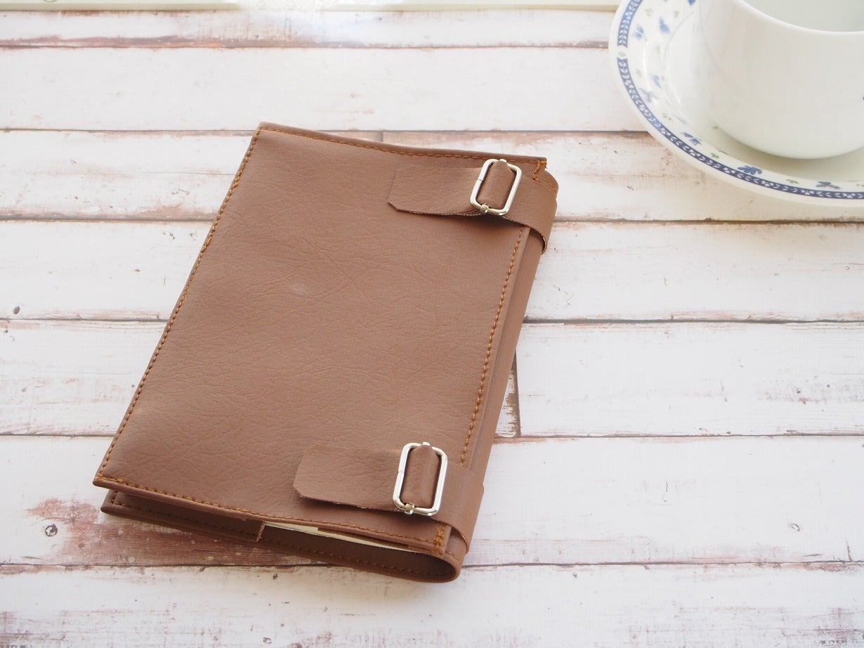 表紙、裏表紙をブックカバーのスリットに差し込んで、ベルトで調整します。
