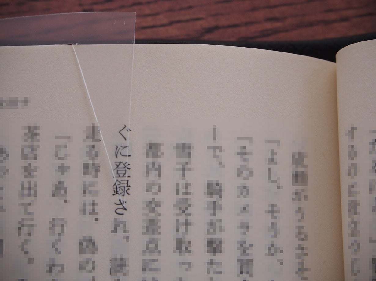 ※撮影のためしおりに着色しています。実際は透明なので読書の妨げになりません。