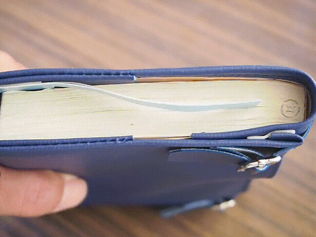 ページをめくると、しおりも同時に動き、常に開いたページに自動しおりのツメが掛かった状態になります。