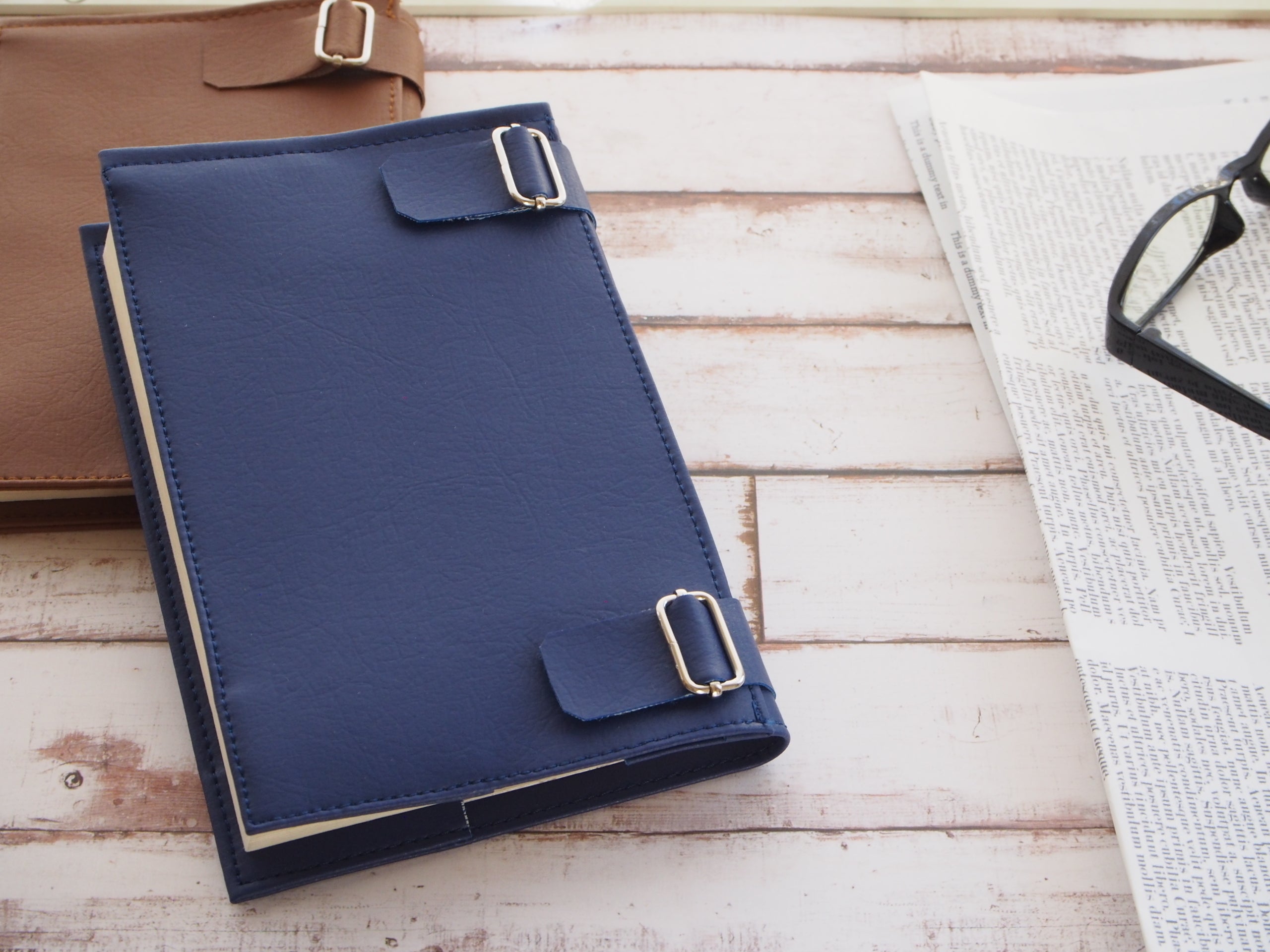 試作段階では、表紙の片側を固定しないで挟み込むタイプも作成しましたが、このタイプではしっかりと本が固定できず、本を読んでいると次第に緩んでくるため、この形(ベルト調整タイプ)を採用しました。