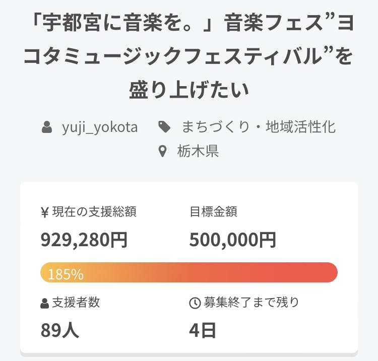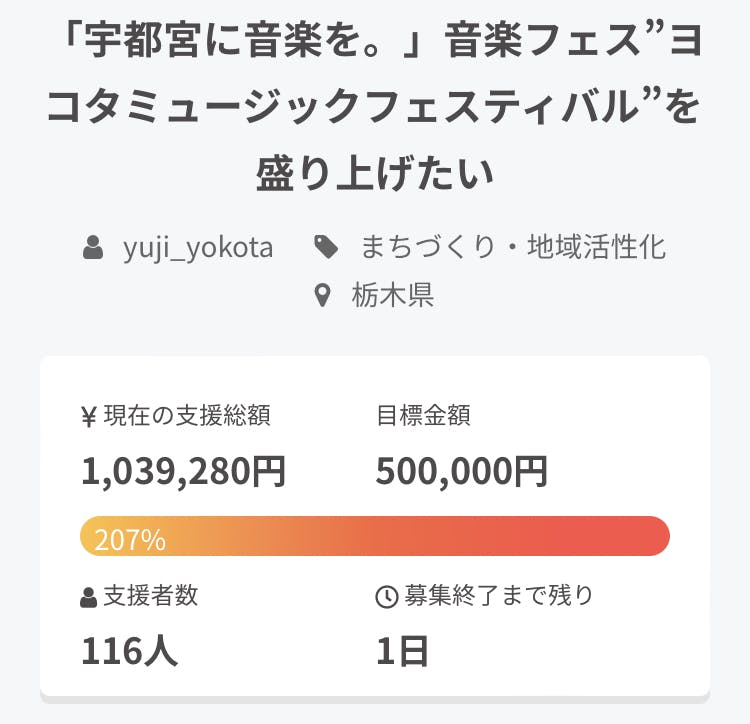 2022/04/26 16:09こんにちは!ヨコタフェス主宰の横田悠二です。皆さんのおかげで、支援金が90万円を超え、185%を達成しました!!応援、ご支援いただいている皆様、毎日クリックしてくれている皆様、ありがとうございます!!もうここまで来たら最後の最後までやり抜き、共にこのクラファンフィナーレを迎えましょう!!横田悠二は毎週土曜日の17:30〜18:30過ぎにJR宇都宮駅にて「原点回帰・路上ライブ」を行っています!ゼロから夢へと再スタートをし、35歳までに日本武道館をめざします!路上ライブは大切な活動のひとつです。皆さん是非遊びに来てみてくださいね!クラファンラストデイ4/30(土)も、やりますよ!詳しくは横田のTwitter(@yokotaug)にて!主宰・横田悠二「ヨコタミュージックフェスティバル2022」2022年8月14日(日)場所:宇都宮市オリオンスクエア料金:入場無料出演:横田悠二 / MIYANOUCHI /オオヌキシンゴ / 竹森マサユキ / P.O.P / HAO / and more....出店:Coming soon.....<キッズスペースあり>※感染症対策をとっての開催となります。 もっと見る