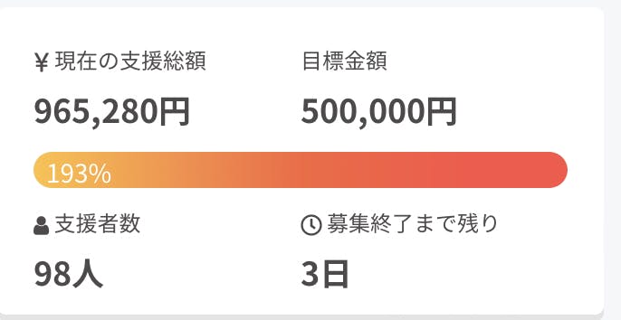 皆さんのおかげで目標の50万円を達成することができました! ありがとうございます。 ご支援いただいた資金は大切に使わせていただきます。