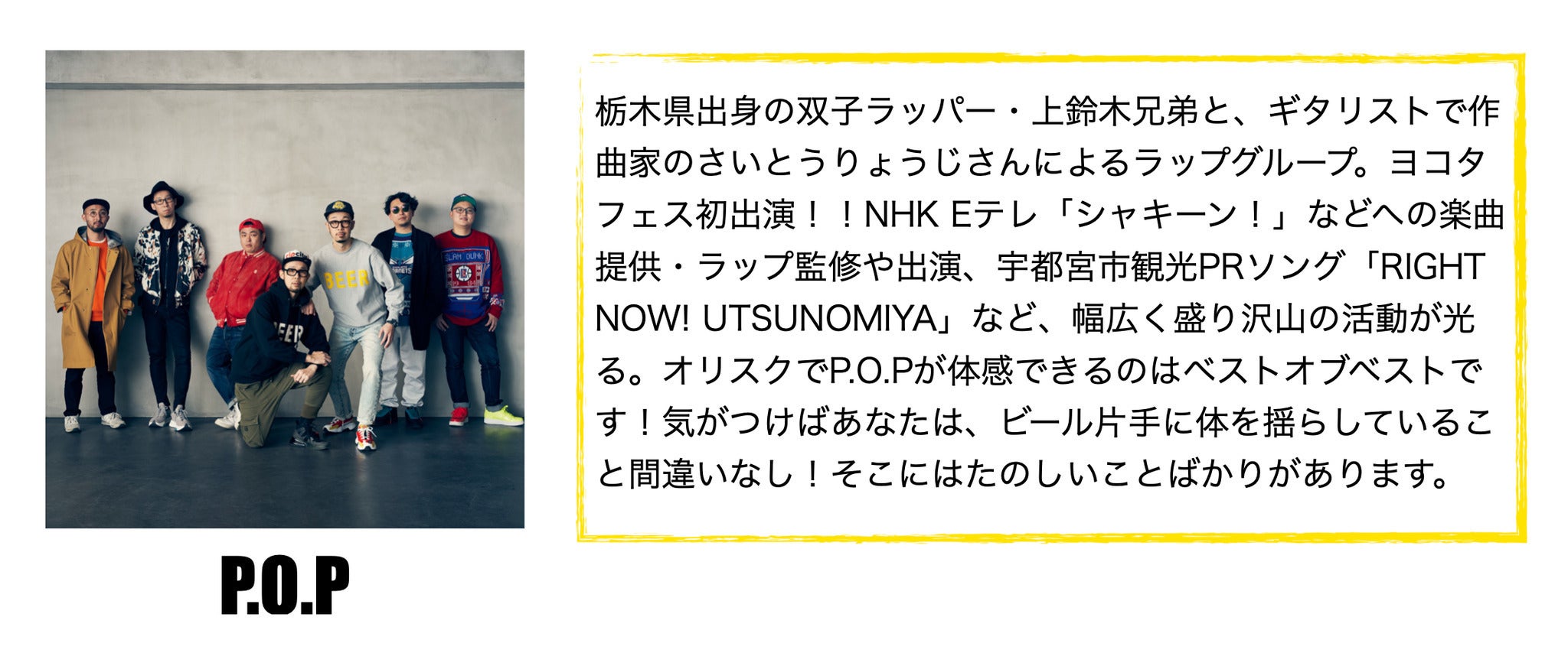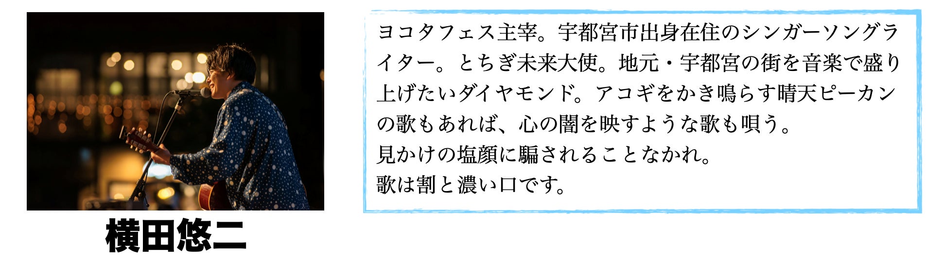 全国ツアーやスガシカオさんのライブでのO.A出演、宇都宮市文化会館でのホールワンマンライブを経て、地元である宇都宮市の街中を音楽で盛り上げるために、野外音楽フェス『ヨコタミュージックフェスティバル』を企画・開催しています。