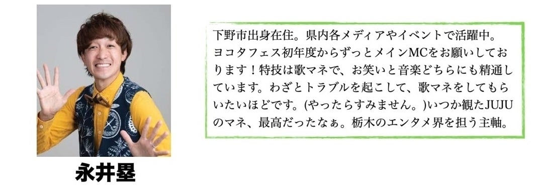 メインMCはFM栃木レディオベリー木曜「BEAT」のパーソナリティや、とちぎテレビ月曜「イブ6プラス」でお馴染みの永井塁さん 。フェスのMCをずっとお願いしている永井塁さん(@rui_nagai_ )とのニヤニヤトークをお楽しみください!