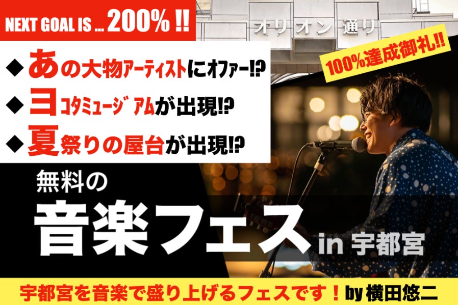 2022/04/26 16:09こんにちは!ヨコタフェス主宰の横田悠二です。皆さんのおかげで、支援金が90万円を超え、185%を達成しました!!応援、ご支援いただいている皆様、毎日クリックしてくれている皆様、ありがとうございます!!もうここまで来たら最後の最後までやり抜き、共にこのクラファンフィナーレを迎えましょう!!横田悠二は毎週土曜日の17:30〜18:30過ぎにJR宇都宮駅にて「原点回帰・路上ライブ」を行っています!ゼロから夢へと再スタートをし、35歳までに日本武道館をめざします!路上ライブは大切な活動のひとつです。皆さん是非遊びに来てみてくださいね!クラファンラストデイ4/30(土)も、やりますよ!詳しくは横田のTwitter(@yokotaug)にて!主宰・横田悠二「ヨコタミュージックフェスティバル2022」2022年8月14日(日)場所:宇都宮市オリオンスクエア料金:入場無料出演:横田悠二 / MIYANOUCHI /オオヌキシンゴ / 竹森マサユキ / P.O.P / HAO / and more....出店:Coming soon.....<キッズスペースあり>※感染症対策をとっての開催となります。 もっと見る