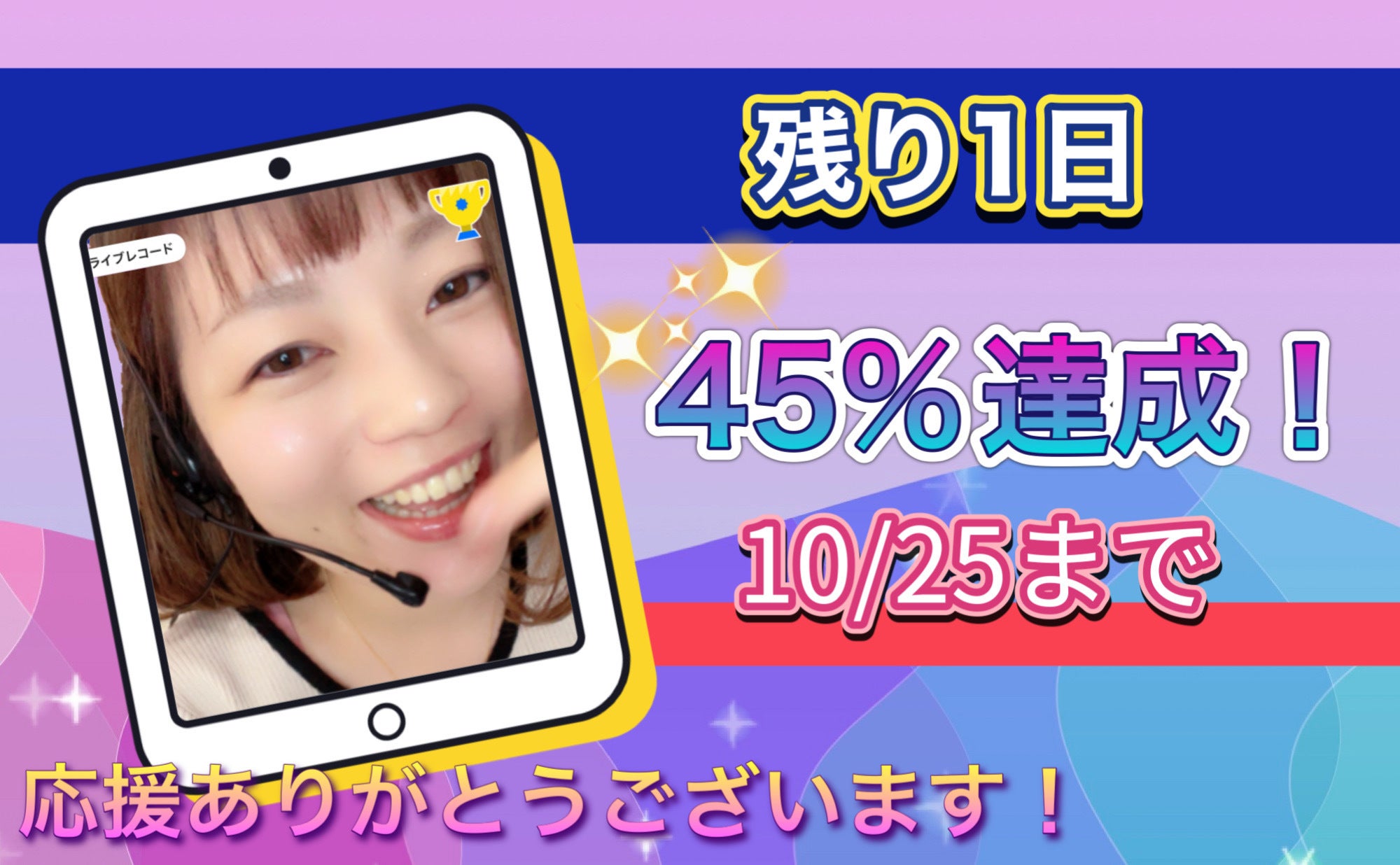 こんにちは。現役ママライバーのつまごんです。クラウドファンディングの応援ありがとうございます。今日は、今の心境とラストの活動予定を伝えさせていただきたいと思います。ここまでの道のり・・・この活動報告を受け取ってくださっている方も私と同じように明日でこのクラウドファンディングが終わるカウントダウンをドキドキ、ソワソワしているのではないでしょうか。9月3日にスタートして、毎日不安とそして応援してくださる方のコメントを読ませていただき胸を熱くさせていただいておりました。2021年の夏から防音室で叫びたいこと、やりたいことをずっと頭の中でイメージして、そして2022年の春に行動に移そうと防音室の見学に行ったりも。行動しているように見えて、もうやり始めるには遅すぎた・・・。そんな不安やモチベーションでなかなか先に進むことができない日々はとても苦しかったです。8月みっちりとプロジェクトの思いを書き出し、形にして9月にやっとスタートできましたが、それもあと1日。ここまで歩んできたきた日々、一緒に背負ってくれているご支援者様に本当に感謝しております。ご支援者様と一緒に叶える「道しるべ」私は、この夢を叶えるのにどれだけの方に影響を及ぼすかとても楽しみにしています。まずは、私の夢の大きな一歩を踏み出します。そしてクラファンやママライバーとしての働き方、同じようなママやシングルマザーの方にも何か道を指し示すようなきっかけになると思っています。私の夢の一歩が、一生懸命駆け抜けることで誰かの道しるべになるとしたら本当に挑戦だと感じています。その挑戦にご支援者様も一緒に戦ってくれていると思うと、この企画はとても意味のあるものになると思っています。必ず形あるものにしましょう^^残り1日にして45%達成!たくさんのご支援に感謝です!!45%まで来ることができました。クラファンが終わったら、リターンの準備に入りますがとても楽しみです。まだ今日、そして1日あります。多くの方に声が届けられるように、悔いのないように駆け抜けたいと思います。募集ラストまでの宣伝活動本日までにカラオケルームを借りて配信を予定しておりました。ですが、視聴率等含めライブファンディングの方が良いのではと変更し、準備を進めてましたが環境が整えることができず、Twitterのスペースを使って宣伝させていただくことにしました。《Twitterスペースによる宣伝会》■10月24日23時〜■10月25日23時〜普段より、一番宣伝しておりましたTwitterにて宣伝をさせていただきます。時間は予定になりますが、活動の宣伝をさせていただきます。また、25日はカウントダウンだけではなくスペースができるときに活用させていただきます。ぜひご参加ください^^■つまごんのTwitterよろしくお願いいたします。