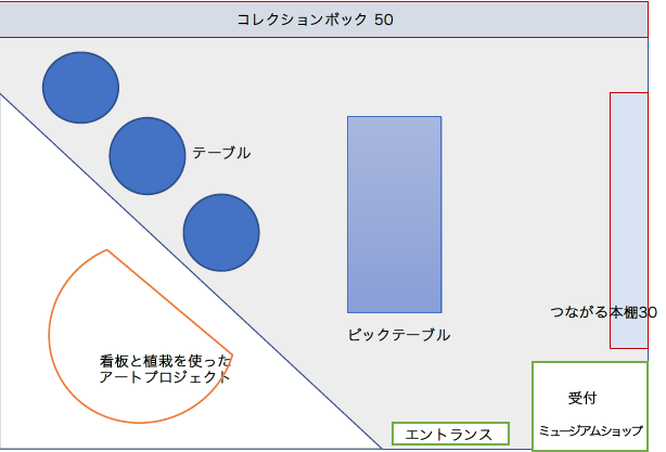 ※ 下の図のエントランスから入って奥のコレクションボックス50のところが、今回の本棚を置くところになります。