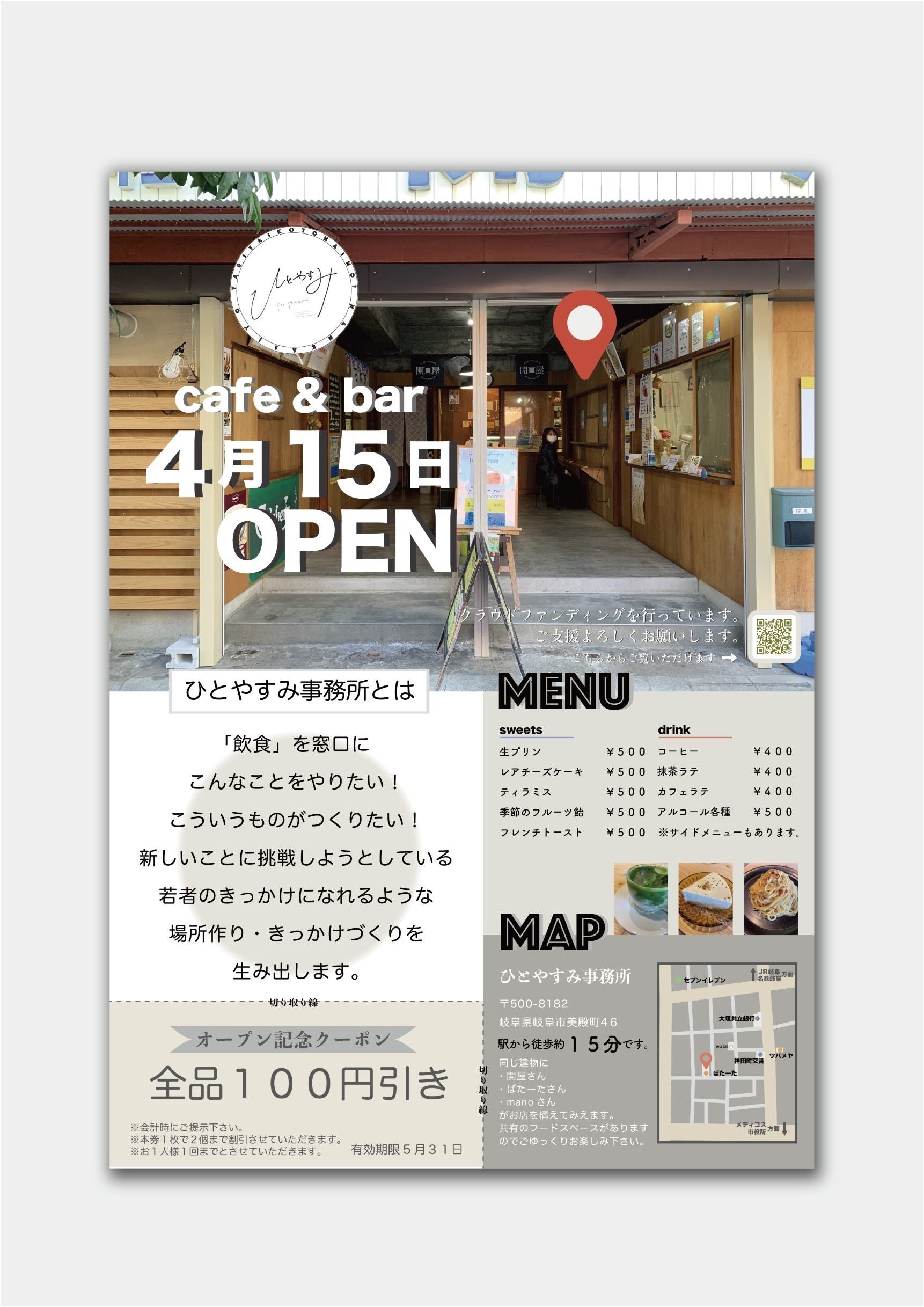 「ひとやすみ」というカフェバーを4月15日にオープンします。