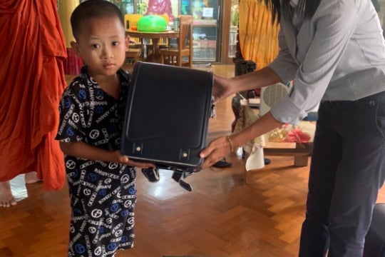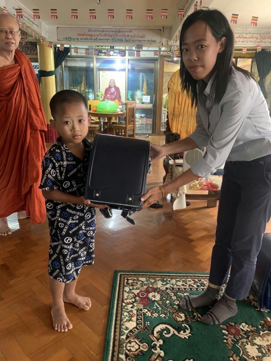 ※テスト発送(2022年1月末にテスト発送)のランドセルは2022年4月30日無事にミャンマーの孤児院へ届けました!! この写真は、2022年4月30日に現地スタッフとお寺の住職さんのご協力のもとに簡単な授与式を行った時のものです。(ヤンゴン寄付ランドセル集積地「7 mile」にて)