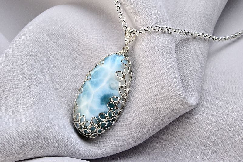 使用する貴石は、都度、仕入れが可能なものを。フレームワークなども細かく、デザイン段階からご参加いただきます。上の画像は5cmのラリマーを花篭フレームで仕上げたもの。