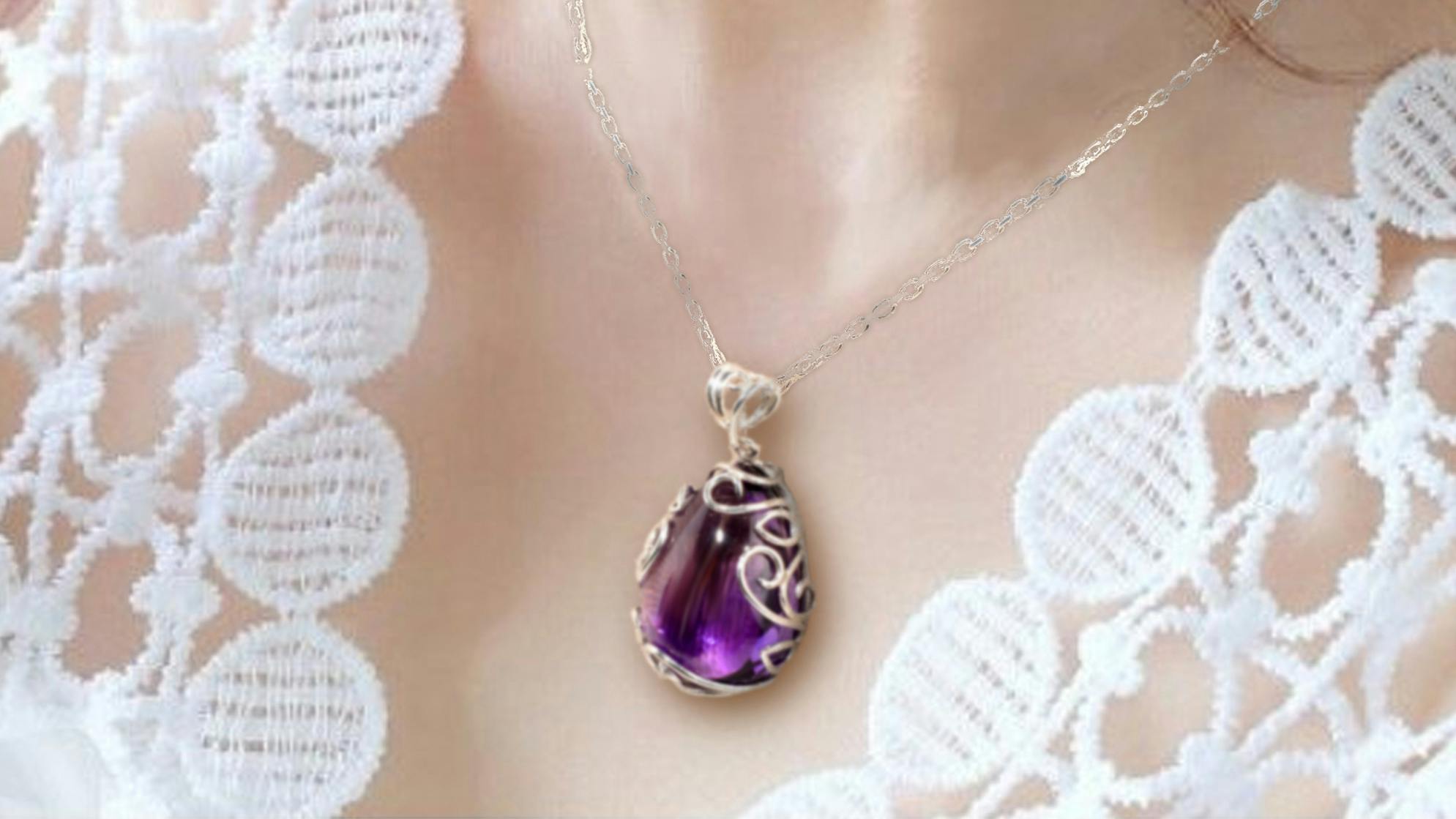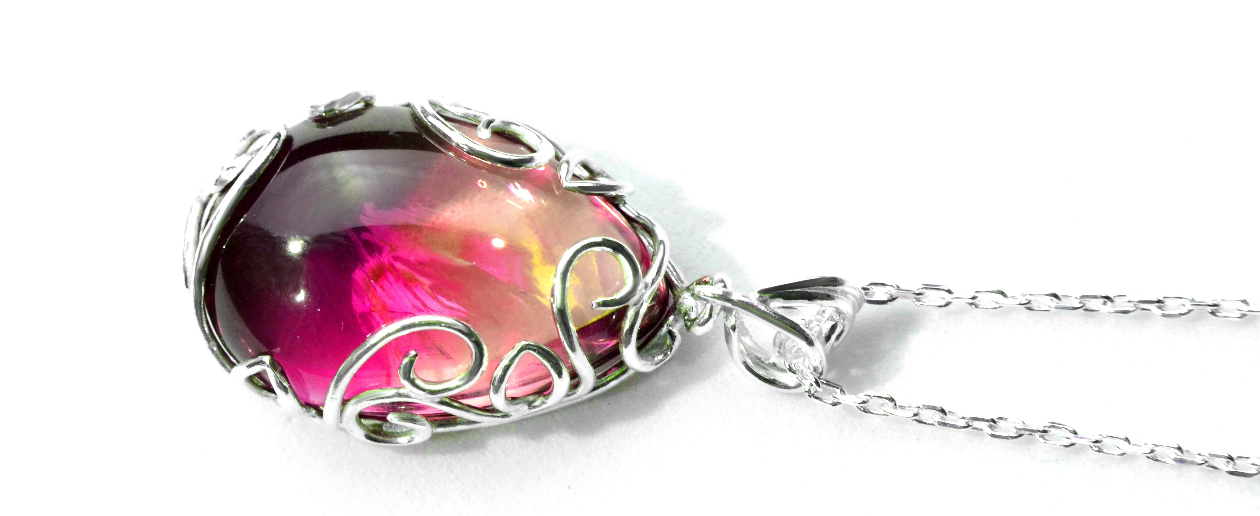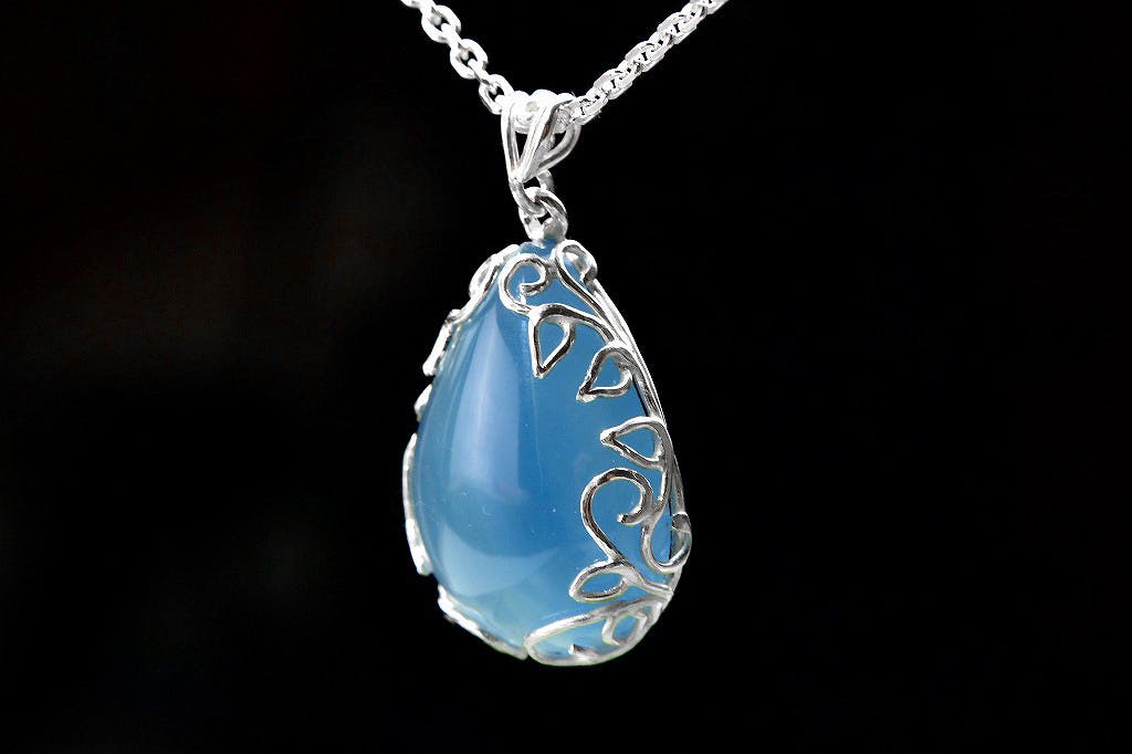 オーバルやティアドロップのカボションカットの30~40㎜くらいの長径の大きな貴石を、アラベスクフレームで仕上げた存在感あふれるペンダントをネックレス付きで。