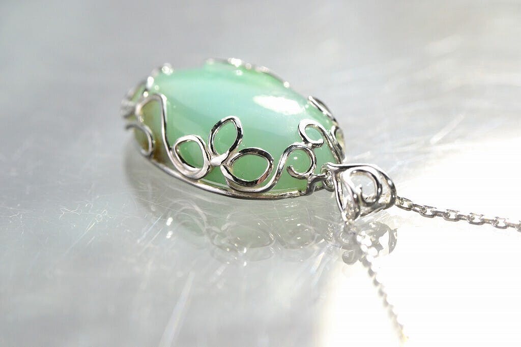 オーバルやティアドロップカボションカットの18~30㎜くらいの長径の貴石を、ボタニカルフレームで仕上げたペンダントをネックレス付きで。