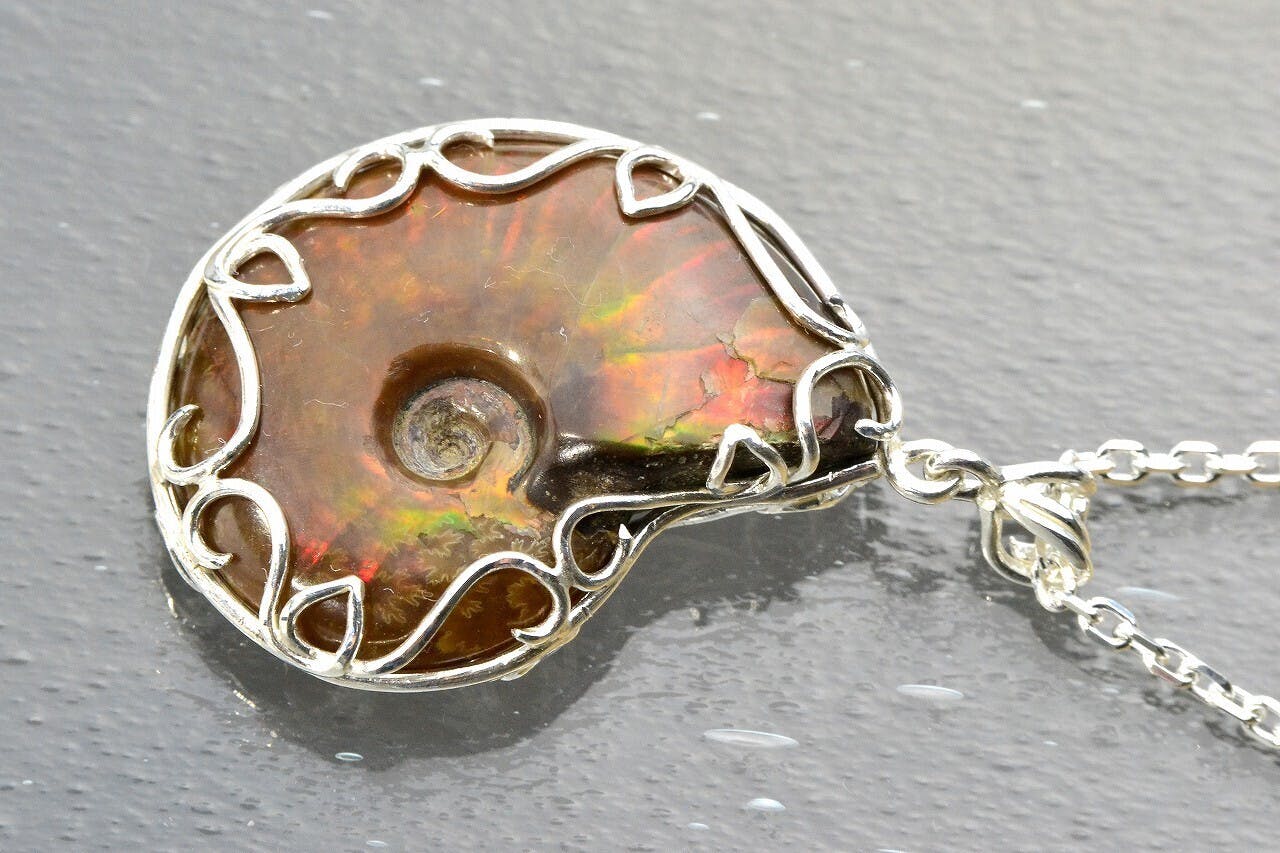 で、この石も内部はぎらぎらのアンモライトなんだけど、ちょうど外殻が石英質で透けてるので、光線の具合によって内部の美しい色が見えていて、この化石のまま使えるという、なかなか希少なものです。