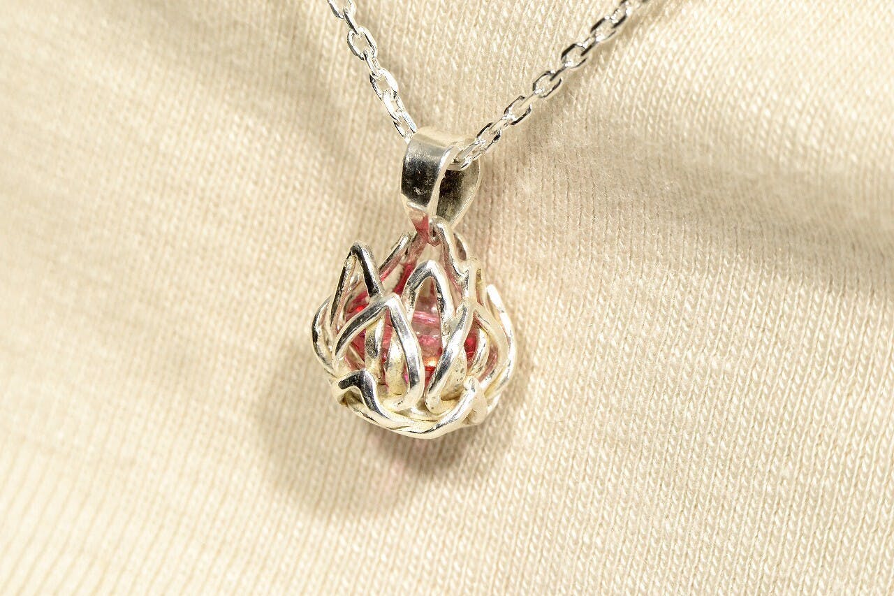 開いた睡蓮が夕刻に閉じてゆくように、真ん中にピンクトルマリンを入れて、ひとつひとつ花弁を傾けて、蕾の状態にした作品なんです。