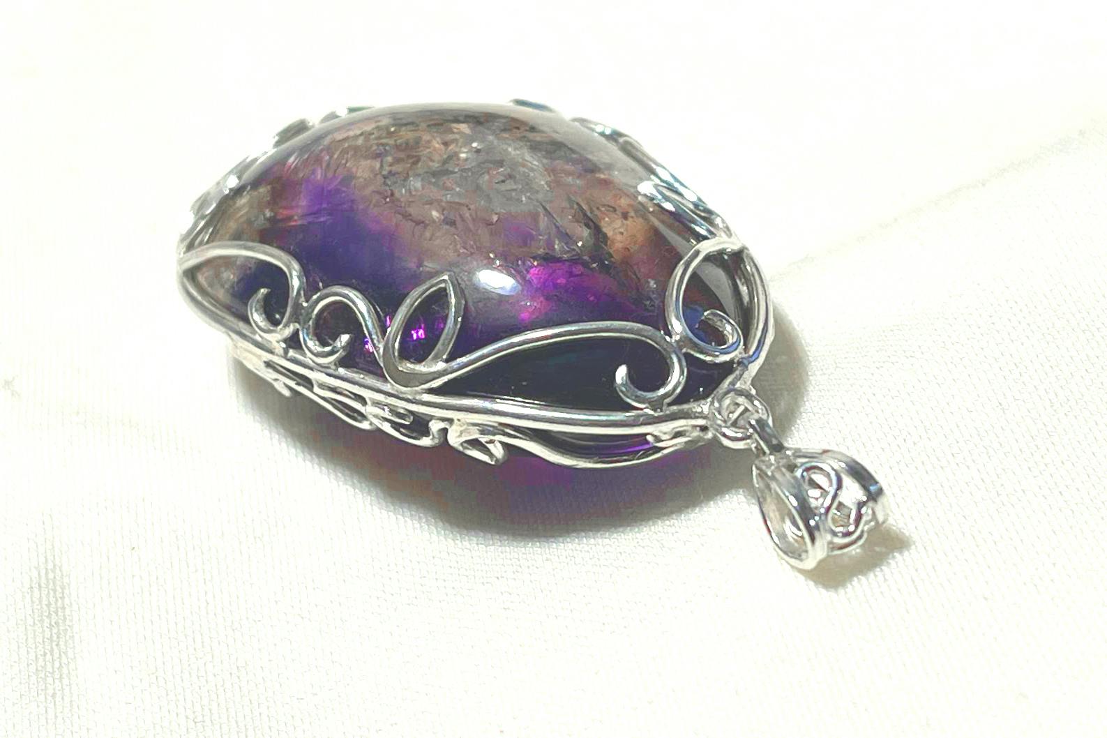 アメジストとスーパーセブンとアイリスクォーツがひとつの鉱石の中に存在しているルース。値段のつけようがないのですが、これをペンダントにとのリクエスト。