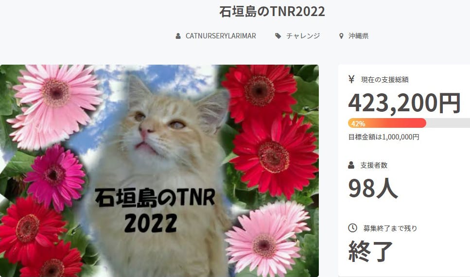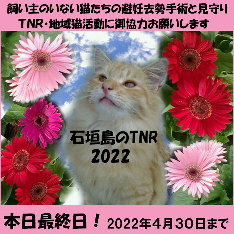 2022/04/30 12:43石垣島のTNR2022、本日4月30日が御支援募集最終日です。日付が変わるまでの募集です。拡散・支援どうぞよろしくお願いします。終了12時間前の支援総額372,700円、89人の方に御支援頂いています。このプロジェクトに御支援頂いた支援総額の7割を飼い主のいない猫が増え過ぎない為の避妊去勢手術に、3割をボランティアたちが見守る地域猫の傷病治療に使わせて頂きます。TNR済みの猫さん。左耳に避妊手術済みの目印(さくら耳)があるので女の子。石垣島は10年前に300頭以上の野良猫の一斉TNRをした島ですが、今もあちこちに未手術の野良猫たちがいます。↑こちらの画像は、去年1月~4月末の3ヶ月間に避妊去勢手術をした野良猫たちです。去年3団体共同でTNRした猫は30匹以上いましたが、その半分以上を猫たちの子育てが終わり次の発情を迎える前の1~2月にこなしていました。この子たち以外にもふくぎの会・島猫見守るニャンの会が独自にTNRした猫たちもいます。現在は地域猫として餌やりボランティアに見守られながら暮らしています。TNRをしなければ、去年40頭以上に増えた野良猫多頭崩壊のような事が起きてしまいます。現在、ふくぎの会やラリマーがTNR相談窓口となり、「〇〇地区に野良猫が増えています。どうしたらいいですか?」というような相談を受けてはTNRについての説明をして解決に向かうようにしています。本日4月30日はプロジェクト最終日。石垣島には多くのTNR候補猫たちがいます。治療が必要な猫たちもいます。日付が変わるまで拡散・御支援どうぞよろしくお願いします。このプロジェクトはAll-In方式です。目標金額に関わらず、2022/04/30 23:59:59までに集まった金額がファンディングされます。支援総額により、TNR頭数・治療出来る地域猫頭数が変わります。 もっと見る