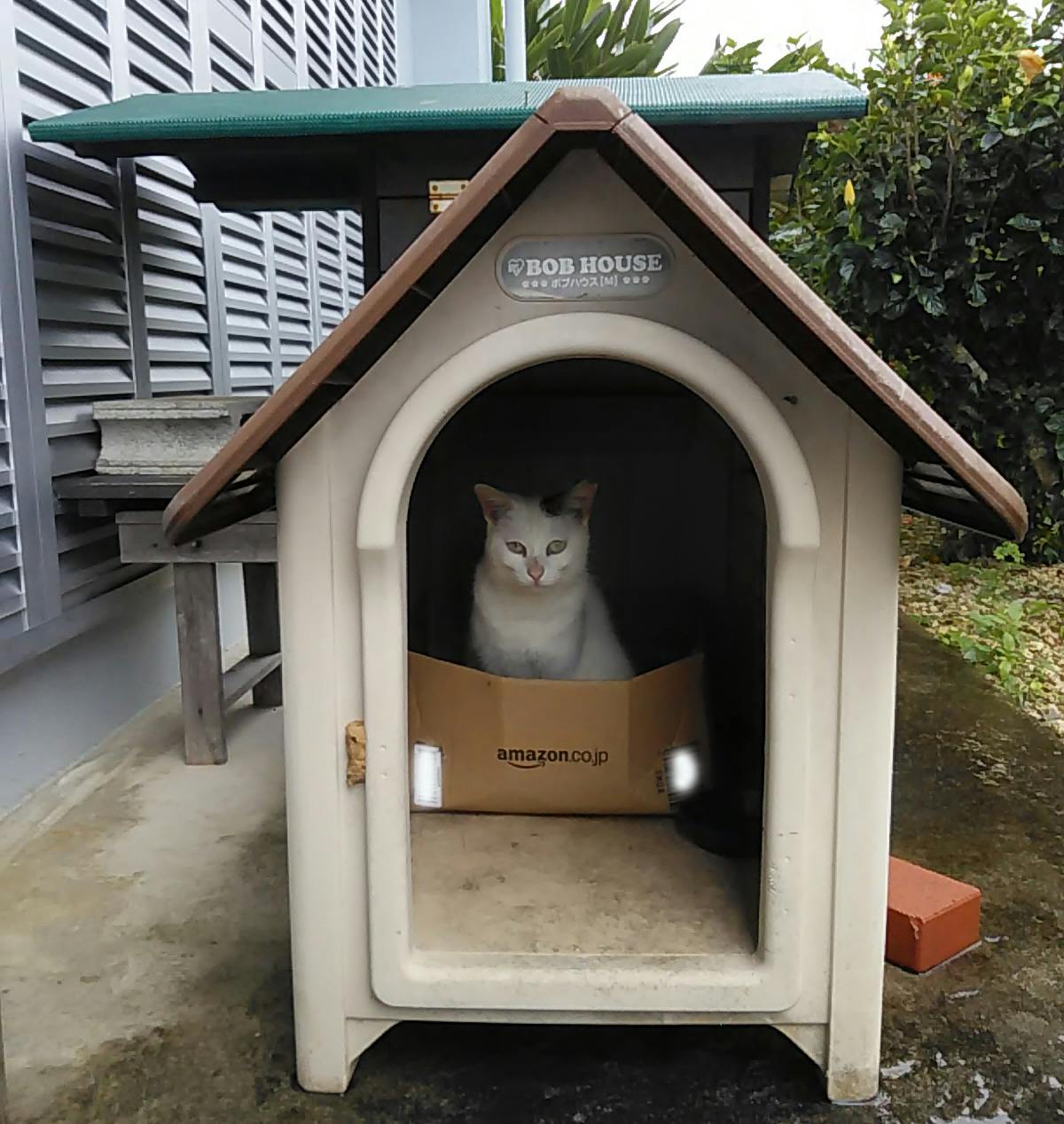 市販の犬小屋に箱を入れて置いた手抜き猫ハウスが気に入ったようで、よく入っています。