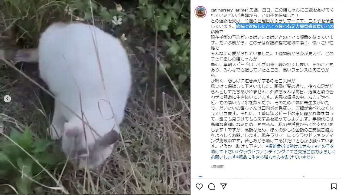 インスタの動画を見ると、猫は立ち上がって歩こうとしても1歩も動けず座り込んでいます。