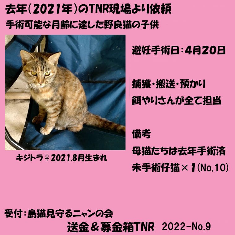 手術を終えた猫たちにはリリース後、隣人たちに見守られつつ穏やかな生活を送ってもらえたらと思います。
