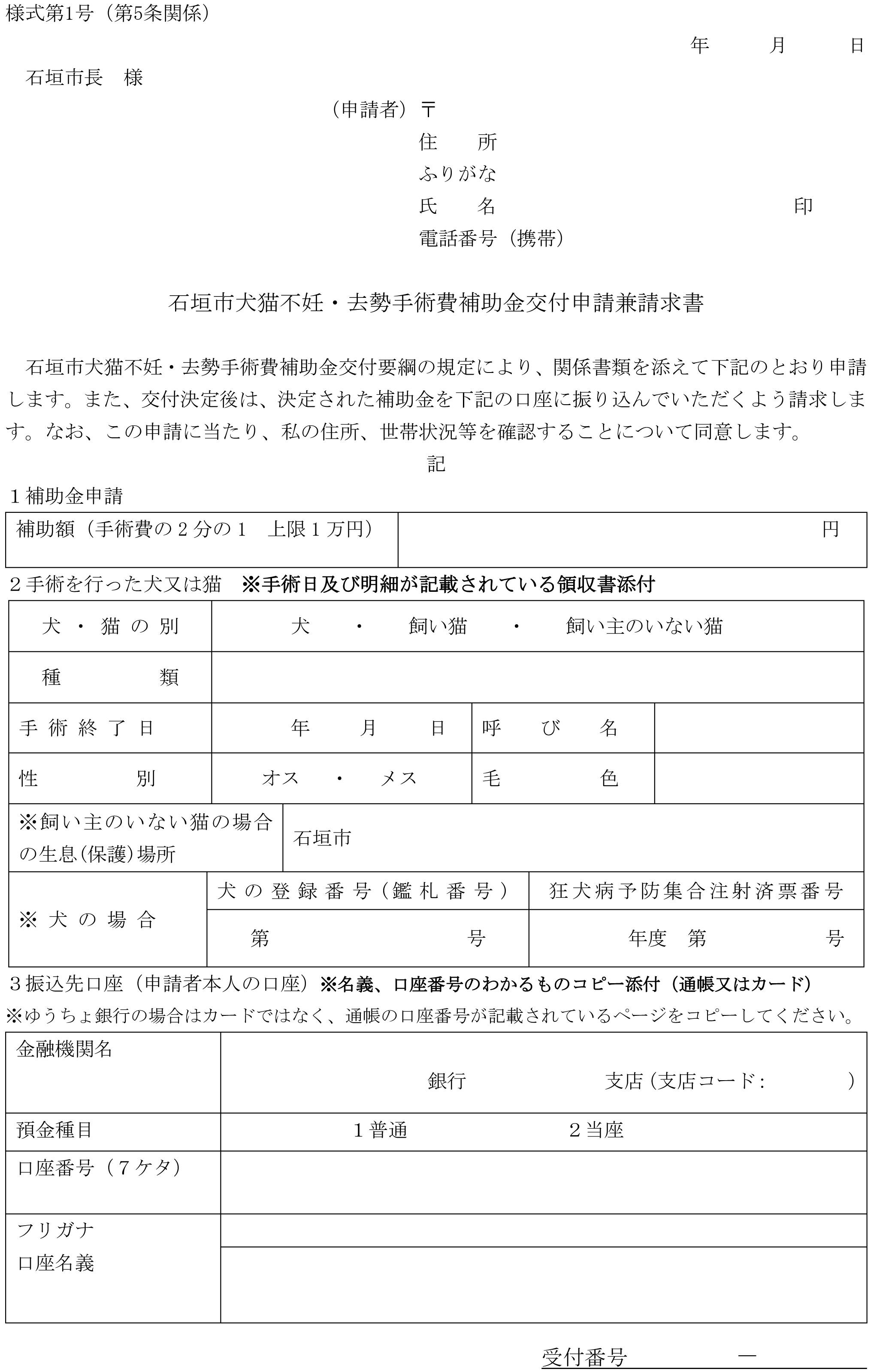 画像は石垣市の犬猫不妊手術助成金の申請書です。