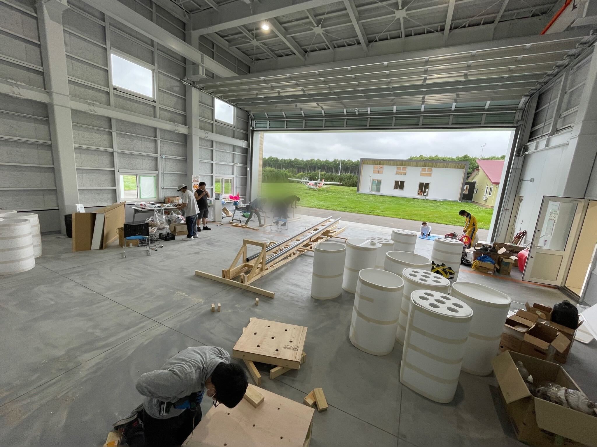 ついに明日、ギネス世界記録Ⓡの挑戦本番を控えています!私たちは、7月28日(木)からここ大樹町で合宿を行い、準備を日々頑張っております。ボディを作ったり、発射台を作ったり進め、7/30(土)にボトルの発射実験を行いました。1本を使ってボトル自身の強度を確かめたり、水量の違いで飛び方を比較しました。耐久力も問題なく、中の水の量は3Lと5Lで飛び方を比較し、3Lの方がよく飛んだという印象でした。7/31(日)東京での試射ではエンジンを4本のボトルで作りましたが、フルパワーを出せるように7本で設計!これは去年の7Lボトルでのエンジンの構造とは同じもので、群馬県立観音山ファミリーパークこども宇宙センターの白田さんから技術を含めて譲り受けたものです。今回はそれを12Lのボトルで新調しました。 セッティングをして、いざ発射!!!本番よりも2mほど小さいロケットでしたが、発射台から飛ぶことができず・・・。原因としては1本途中で水漏れを起こしており、ノズルに挟んだパッキンがねじれていたことがわかりました。そして、ノズルを含め、エンジン部分の重量が前回のものよりも重くなっていることが考えられました。前回3月の挑戦、あのビジョンがここでも再び。この結果を踏まえ、夜作戦会議です。8/1(月)の今日昨日の失敗を成功に近づけるために3つのポイントで大改良を開始しました。1.パワー増強2.軽量化3.すべりやすくするパワー増強のため、発射口付近の受け皿となる板を発泡スチロールから木の板に変更。機体を軽くするために軽量化。ボディの内部となる上底、下底に穴をあけ、空気抵抗に影響が出ないように改良。こういった工作が得意な学生がフリーハンドでも円をきれいに切り取ってくれます!リボルバーのような見た目になりました!(内側なので完成時には見れませんが…)発射台には塩ビパイプをセットして、摩擦をできる限り軽減を図ります。ボディを連結!これで7mちょっと足りないくらいです。エンジンを連結させて7m超のロケットになります!いよいよ明日本番、この後打ち上げテスト頑張ります!!