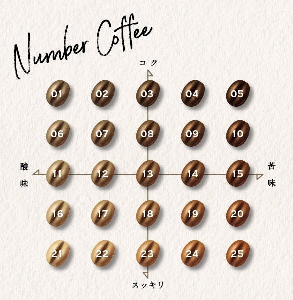 そして、その25種類のコーヒーをより感覚的に・より楽しく選んで頂けるようデザインしたものが、このナンバーコーヒーチャートです。