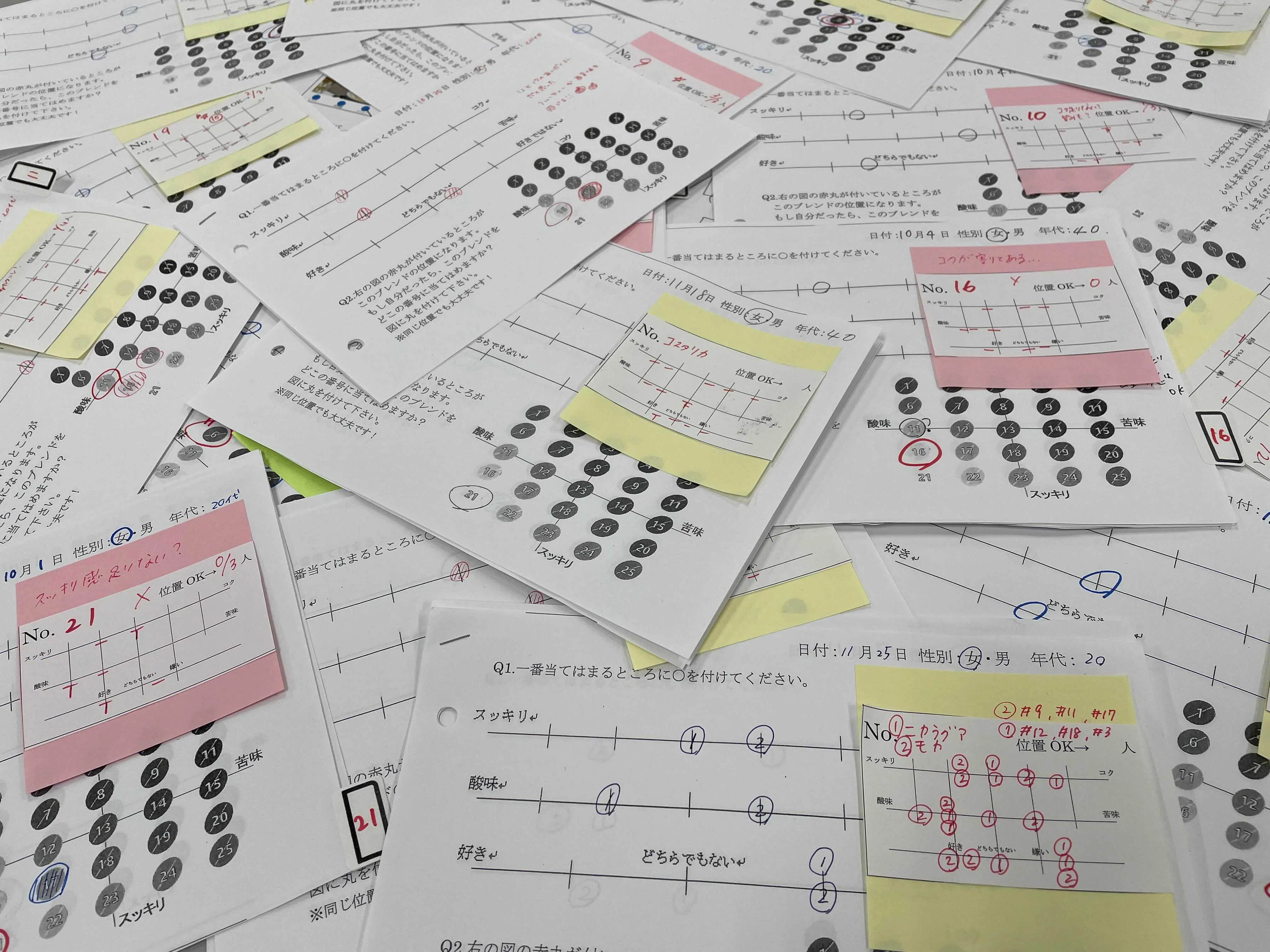 そしてそれをもとに、苦味・酸味・コク・スッキリの指標を決定し、社内で1000回以上にわたるテイスティングやアンケートを経て、この軸に分布する25種類のコーヒーを完成させました。