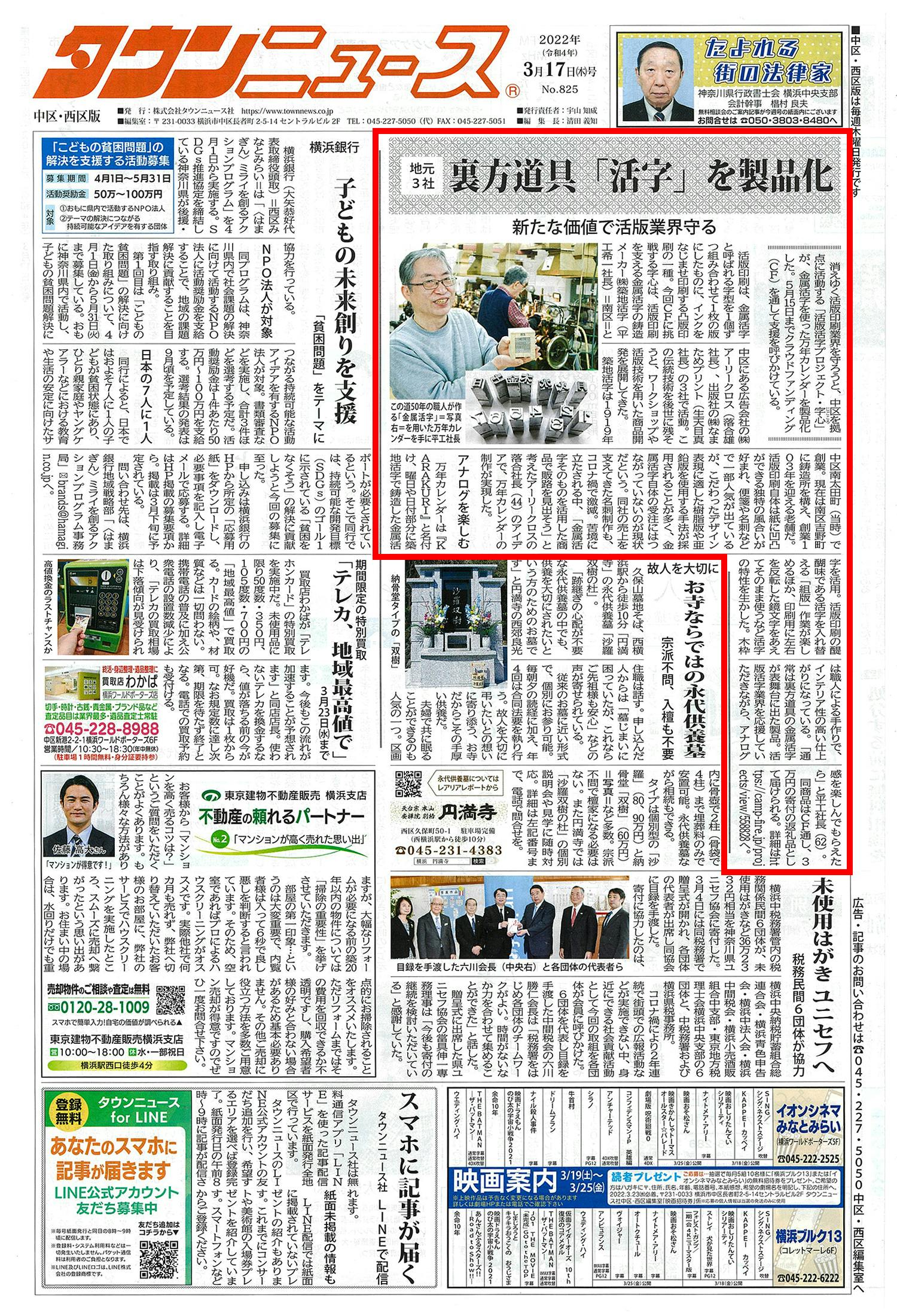 タウンニュース様にて、活版活字プロジェクト「字心」の「KARAKURI」が取り上げられました。
