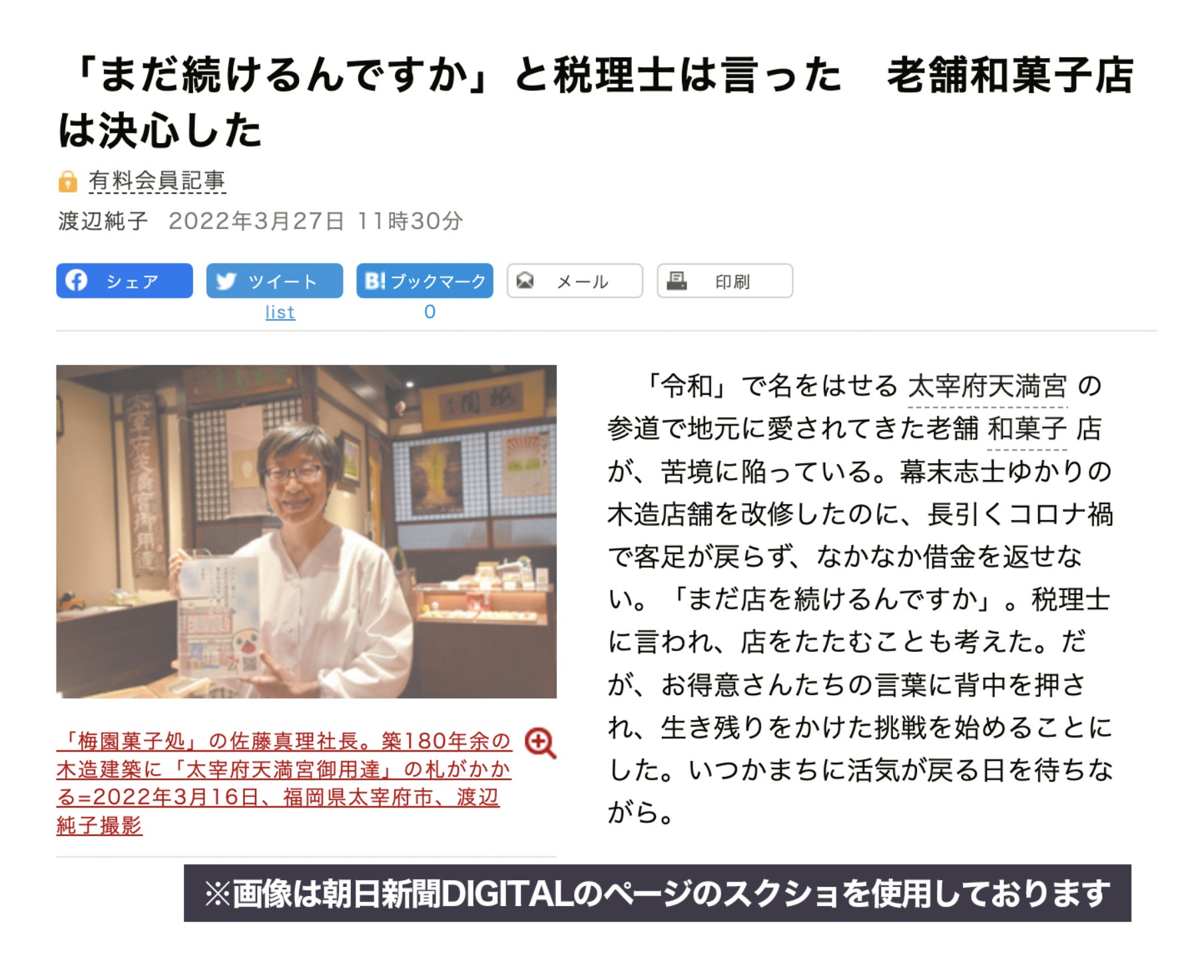 早速ですが、本日の活動報告は朝日新聞デジタル版にご紹介いただきました、梅園菓子処の記事になります。