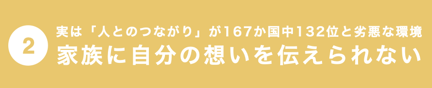 しかし国の豊かさを測る「レガタム繁栄指数」という調査結果では「社会関係資本」が167か国中132位と世界的に見ても劣悪です(2021年)。