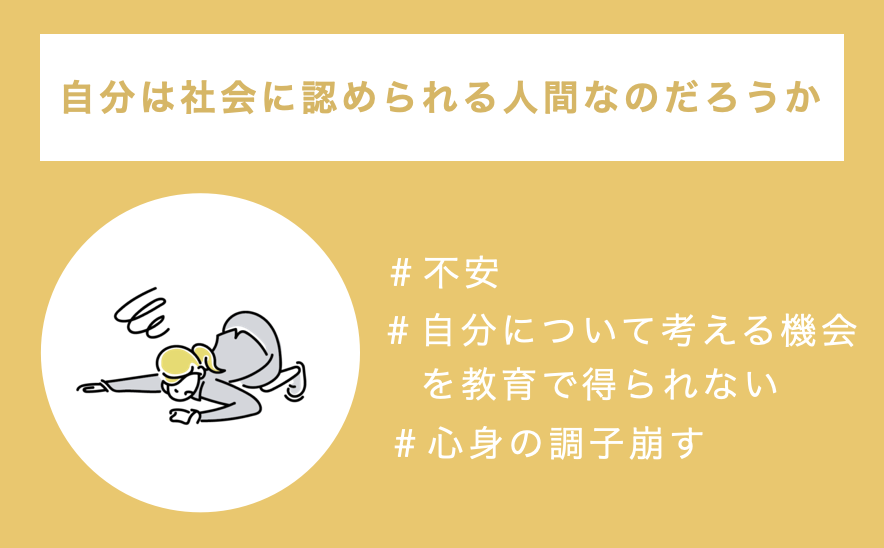 今の20代は、十分に自分について知り、考えることができないまま、就活をしたり、社会人になるという場合がほとんどです。「自分は社会に認められる人間なのだろうか」とどこか不安を感じたまま働いています。