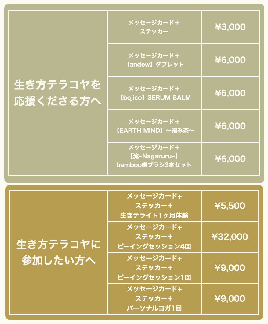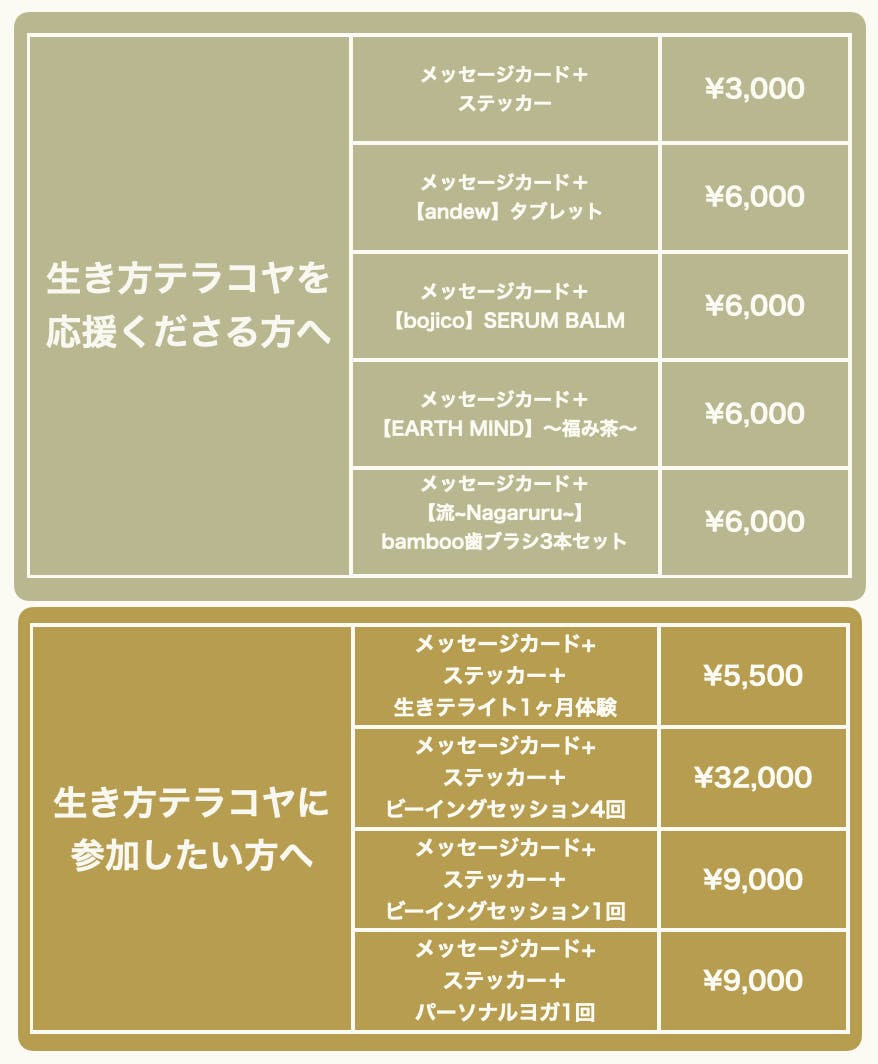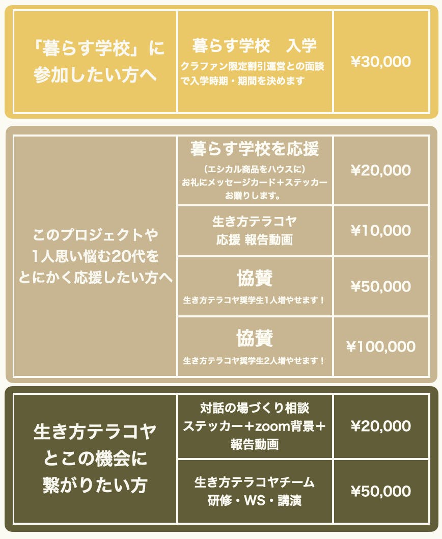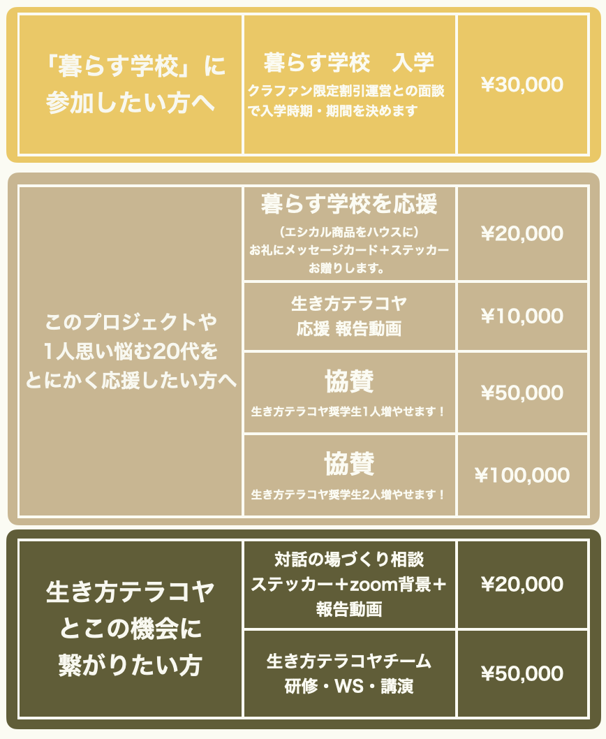 今回は、暮らす学校を応援してくださる方にも体感していただきたく、リターンにもエシカル商品+応援プランを用意しています!