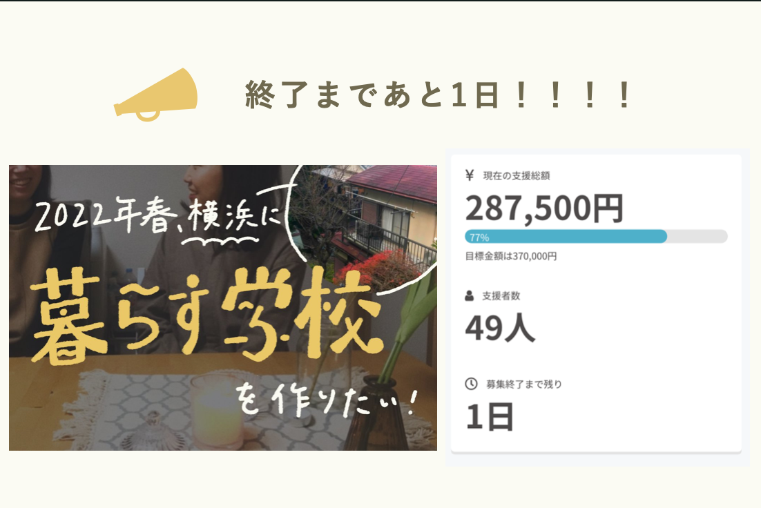 2022/04/09 13:00ご支援くださった方、応援くださっている方、ありがとうございます!あっという間にクラウドファンディング募集終了まであと1日になりました。ここまで49名の方に287,500円のご支援をいただき、現在、77%になりました!!!本当に、ご支援くださった方、応援くださる方には本当に感謝でいっぱいです!一方で、プロジェクト成功まで少し厳しい状況になってきました。そこでお願いです。このプロジェクトをシェア・拡散し、共に拡げていただけませんか??ここまで多くの方にご協力いただきました。あとはいかにご共感いただける方の元まで届けられるかにプロジェクトの成功が掛かっています…!そして何より、ラストスパートは皆さんと共に盛り上がって駆け抜け、一緒に成功をわかちあいたい!!!笑そんなわけで、引用リツイートなどみなさんの言葉でシェアいただけたら泣いて喜びます…!!!(もちろん、シェアボタン、リツイートでも大歓迎です!泣いて喜びます!!)1人でも多くの思い悩む20代に対話に溢れる暮らし、そして自分を知り、健康的に悩む機会を届けられるようこのプロジェクトを成功というかたちで終了させたい!!!!ご協力、どうぞよろしくお願いいたします!!!生き方テラコヤ・暮らす学校プロジェクト 桜田千江里▼プロジェクトはこちらにて発信しています!生き方テラコヤTwitter:https://twitter.com/ikikataterakoya生き方テラコヤFacebookページ:https://www.facebook.com/ikikata.terakoya もっと見る