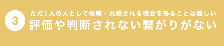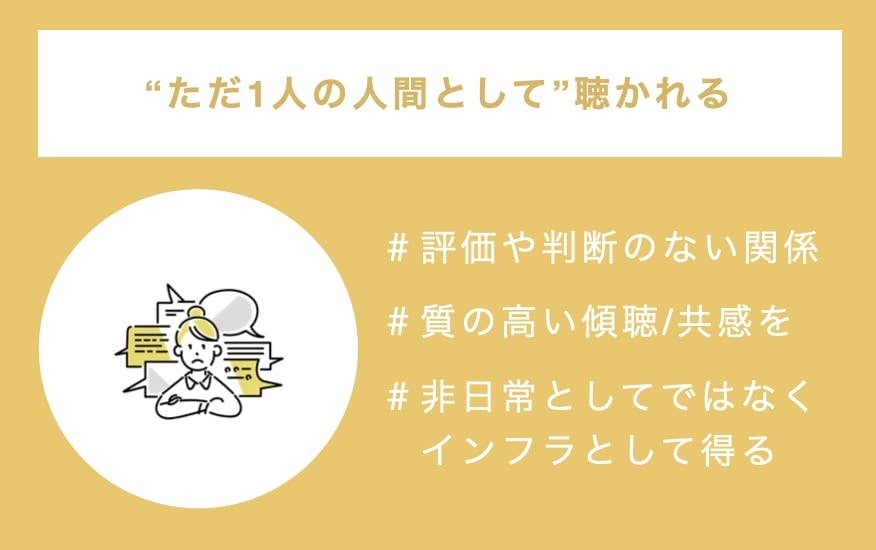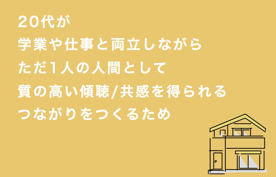 日本でも1on1やコーチングなど組織内で対話を取り入れることも主流となり始めました。しかし、その機会をすべての人が得ることは難しい現状です。また、働く中では経済合理性も重要視されます。人生の基盤をつくる20代にとっては「ただ1人の人間として、他者に傾聴/共感される」ことが必要です。