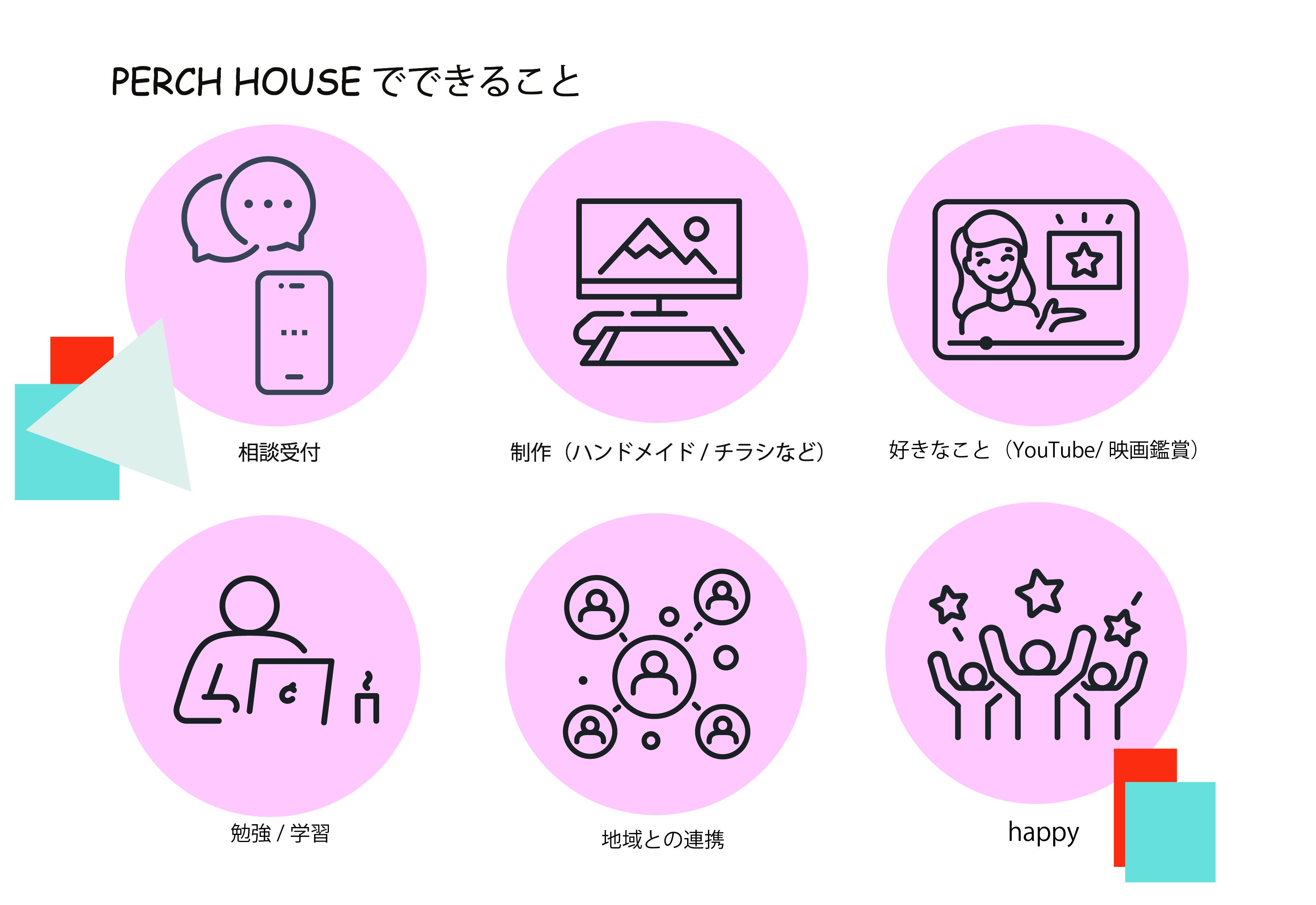 悩み事の大きさや、深さは人それぞれ。まずは気軽にパーチハウスへ来てもらい「好き」や「仲間」と出会い、自分の「居場所」を見つけて欲しい。