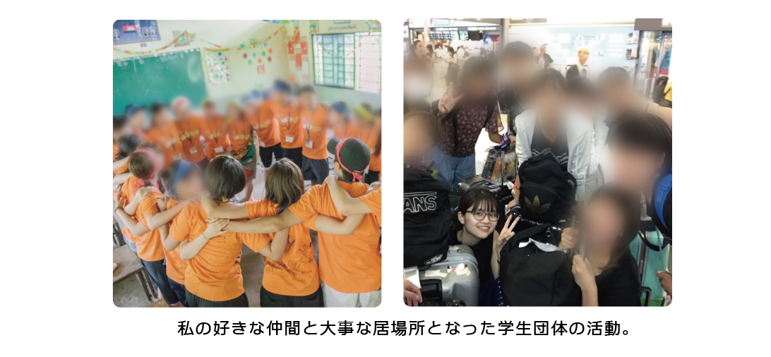 私は大学1年生の時から4年間学生団体に所属しカンボジアの学校に行き運動会を開催するという目標に向けて、同じ志を持つ仲間たちと共に、時には夜を徹して、喧嘩になるくらいの意見を交わしながら目的の達成に夢中になっていました。その時の経験により、私は自分だけの力では変えようのない目先の問題に固執して、状況を変えられない自分を責めたて自分を失うことより、自分だけの居場所を他に見つけて「やりたい」と思えることを、一緒に追求していける仲間と切磋琢磨しながら自分自身を高めていくことの方がよっぽど価値あることだと考えるようになりました。
