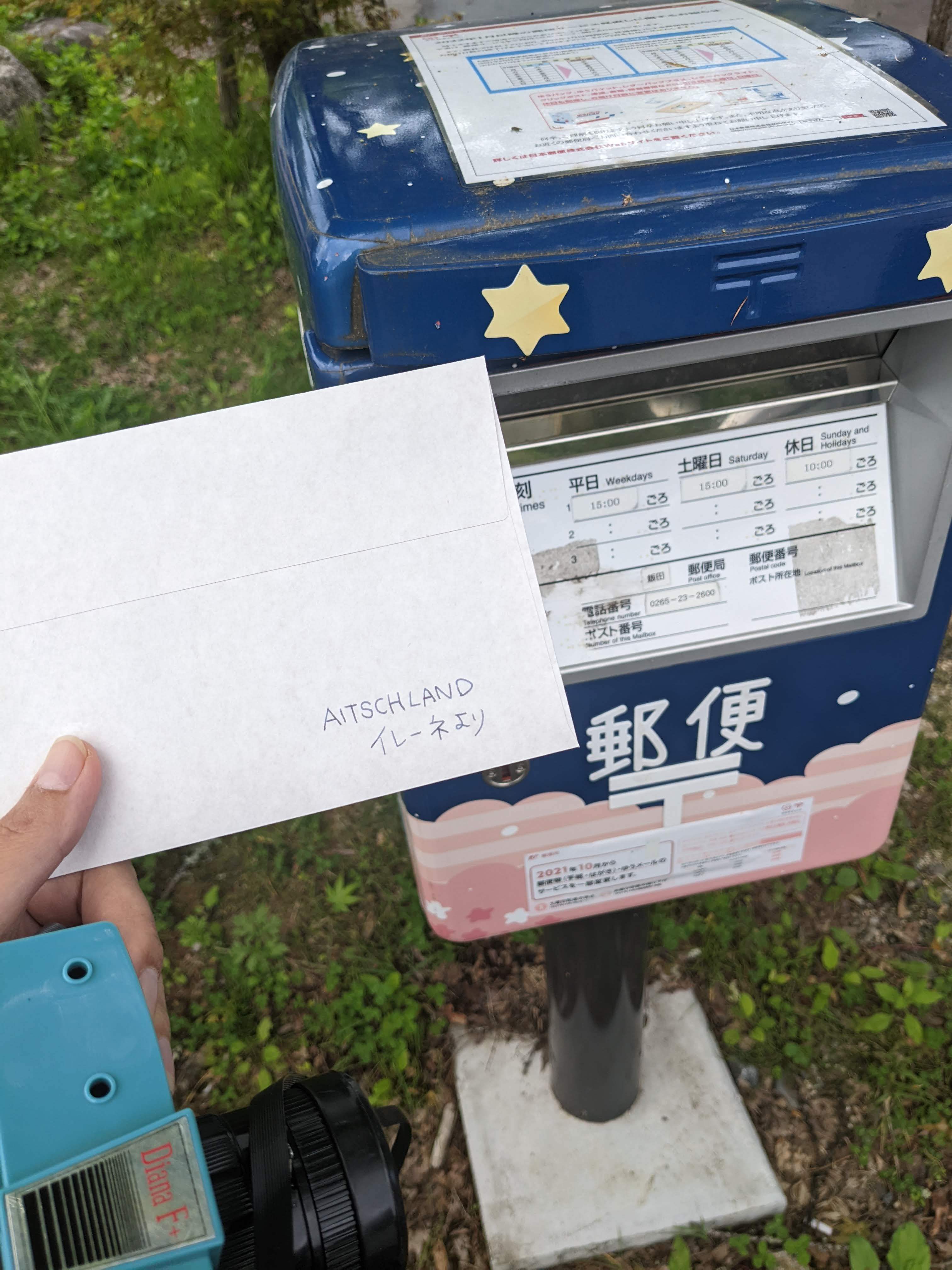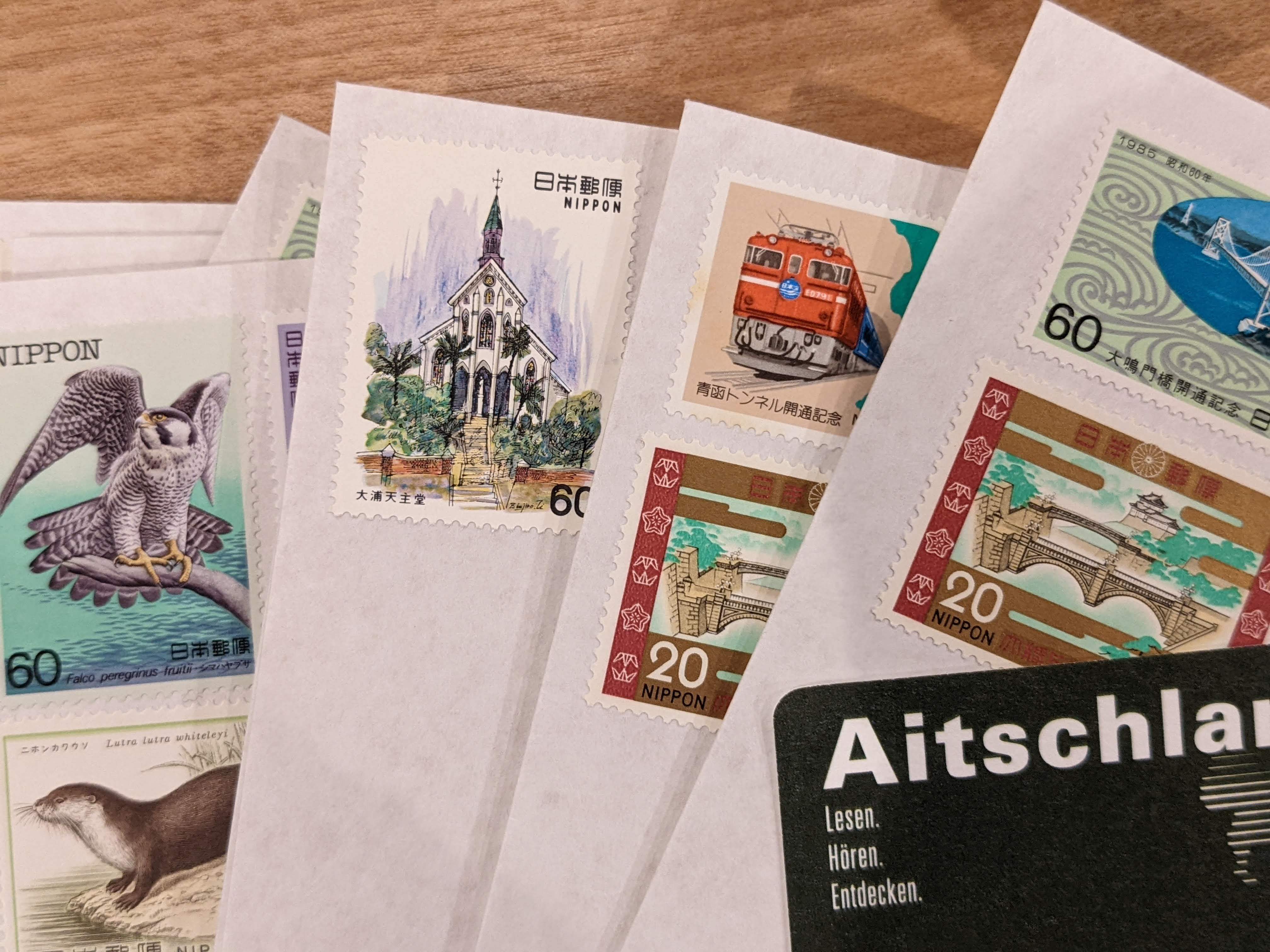 AITSCHLANDオリジナルのカードに1通ずつ手書きで書いています。署名とか宛名だけでなく、本文ももちろん全部手書きです。先日冊子なしのリターンを選んでくださった皆様に一足先に発送。この方々のみ、父が昔集めていた切手を使って発送しています。