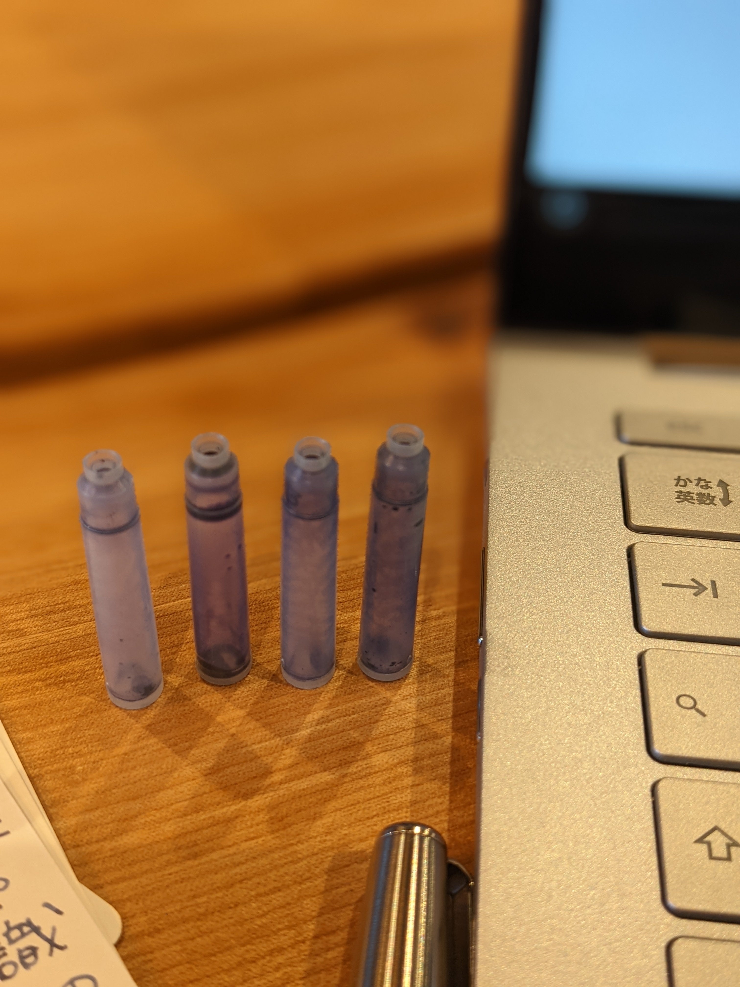 手紙を書くペンは、万年筆を使っています。特に理由はないのですが(笑)たまたま3月にお友達に頂いたのと、そういえばドイツでは小学生から学校でも万年筆を使っていたよなとふと思い出して・・・。ブルーブラックのインクがいい感じ。字、汚いですが許して・・・!