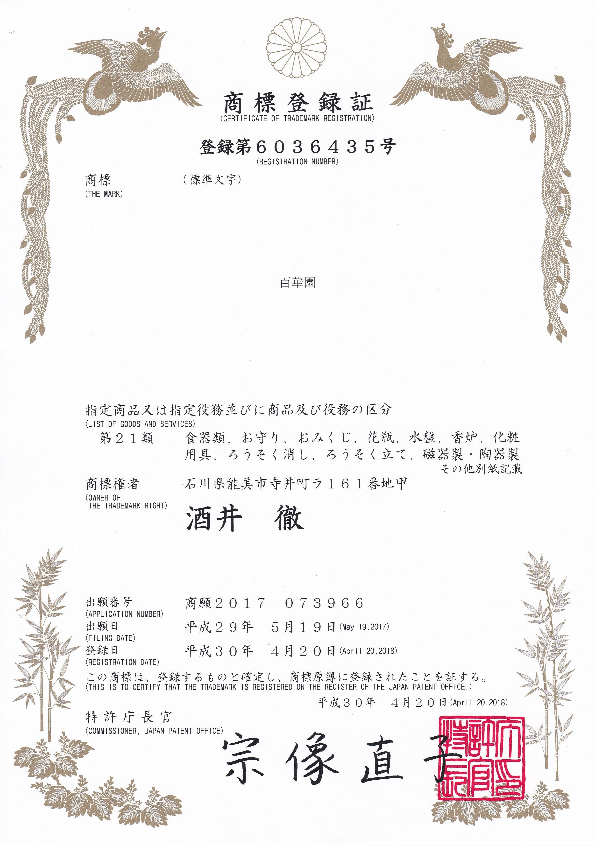 時代の流れで伝統工芸品のシェアも落ち込みの現状ではありますが歴史を支えてくださいましたお客様に感謝し、【今のお客様に支持される九谷焼作りに励んでおります。】日々の事業活動から得られる独自の想いや製品へのこだわりは大きなくくりでいえば、知的財産。大切な財産であることは事実でこれらを無駄にしないため、売り上げを伸ばす事で事業継続を趣旨としております。
