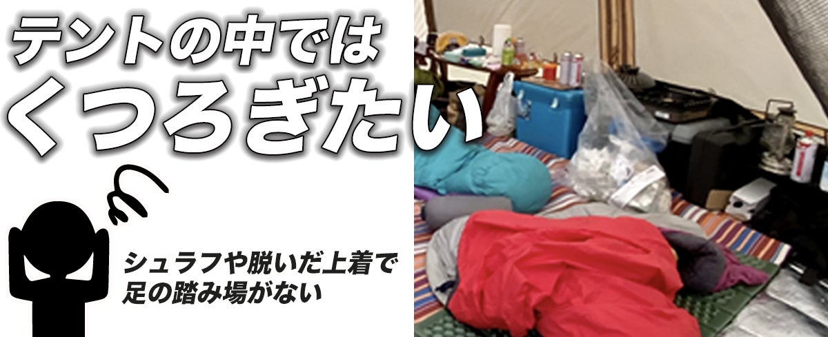 椅子やハンモックの上には脱いだジャケット、テーブルの上にも荷物、テントの中はリュックやシュラフで足の踏み場がない。そんなキャンプあるある。