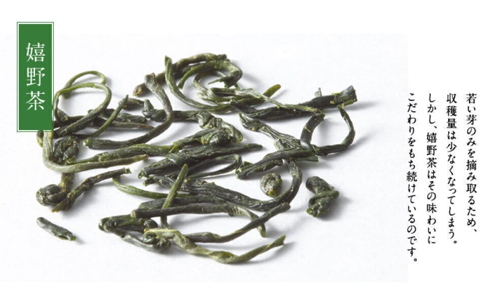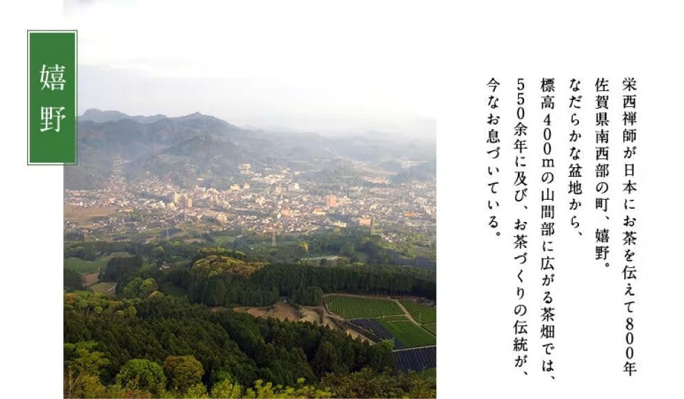 佐賀県南西部にある町、嬉野。なだらかな盆地から、標高440mの山間部に広がる茶畑で550年余に及びお茶づくりの伝統が続いています。霧が多いこの地域は日照量が適度に制限され、昼夜の温暖差がありお茶の栽培に適しています。適度に日の光を浴びないことで茶樹は茶葉の成分を絶妙にコントロールし、旨みのあるお茶が生まれます。みる芽と呼ばれる若い芽を摘み取るため、収穫量はさらに少なくなりますが、その味わいにこだわりを続けています。