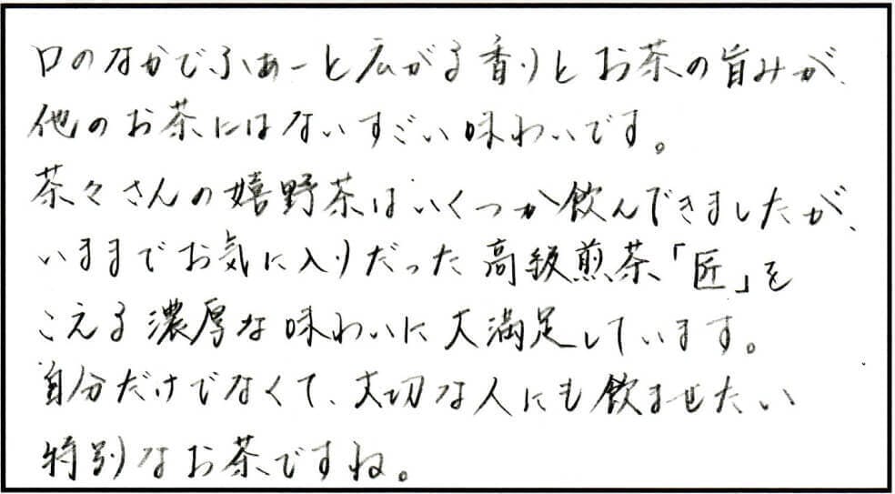 口のなかでふぁーと広がる香りとお茶の旨みが他のお茶にはないすごい味わいです。茶々(尚茶堂)さんの嬉野茶はいくつか飲んできmしたが、いままでお気に入りだった高級煎茶「匠」を超える濃厚な味わいに大満足しています。自分だけでなくて、大切な人に飲ませたい特別なお茶ですね。