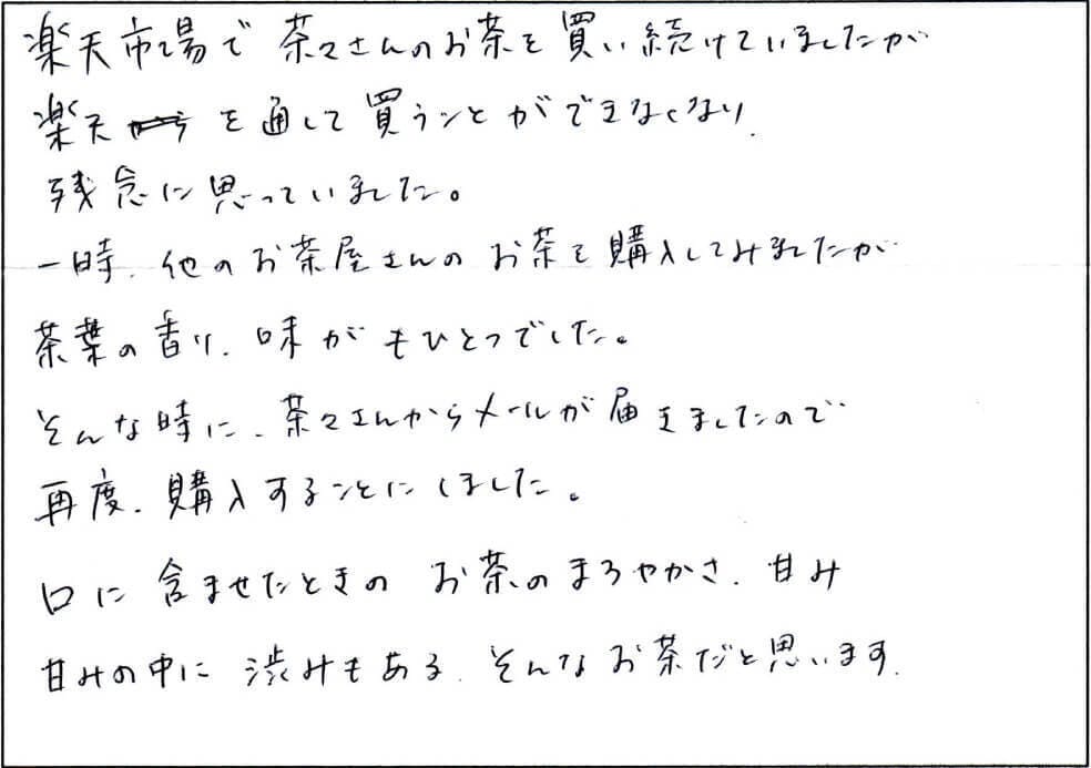 楽天市場で茶々(尚茶堂)お茶を買い続けていましたが、楽天を通して買うことができなくなり、残念に思っていました。一時、他のお茶屋さんのお茶を購入してみましたが、茶葉の香り、味がもひとつでした。そんな時に、茶々(尚茶堂)さんからのメールが届きましたので、再度、購入することにしました。口に含ませたときのお茶のまろやかさ、甘み、甘みの中に渋みもある、そんなお茶だと思います。